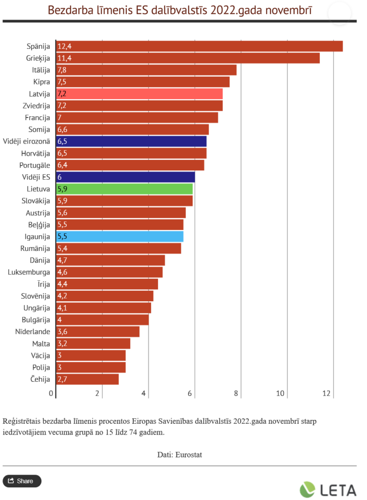 Savukārt zemākais bezdarba līmenis novembrī reģistrēts Čehijā (2,7%), Polijā un Vācijā (abās valstīs 3%), kā arī Maltā (3,2%). Igaunijā bezdarba līmenis bija 5,5%, bet Lietuvā – 5,9%.