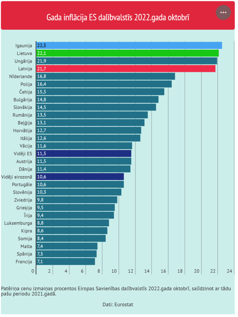 Gada inflācija Latvijā oktobrī bijusi 21,7%. Augstāka inflācija pagājušajā mēnesī bijusi Igaunijā (22,5%), Lietuvā (22,1%) un Ungārijā (21,9%).