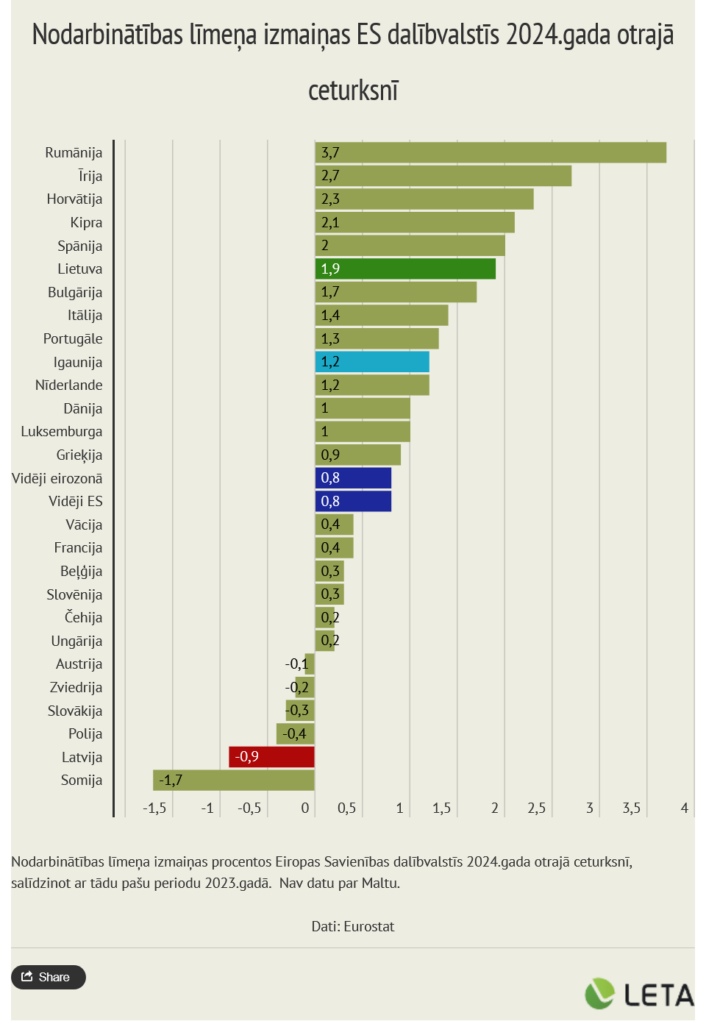 Nodarbinātības kritums otrajā ceturksnī vēl fiksēts Austrijā (-0,1%), Zviedrijā (-0,2%), Slovākijā (-0,3%), Polijā (-0,4%) un Somijā (-1,7%).