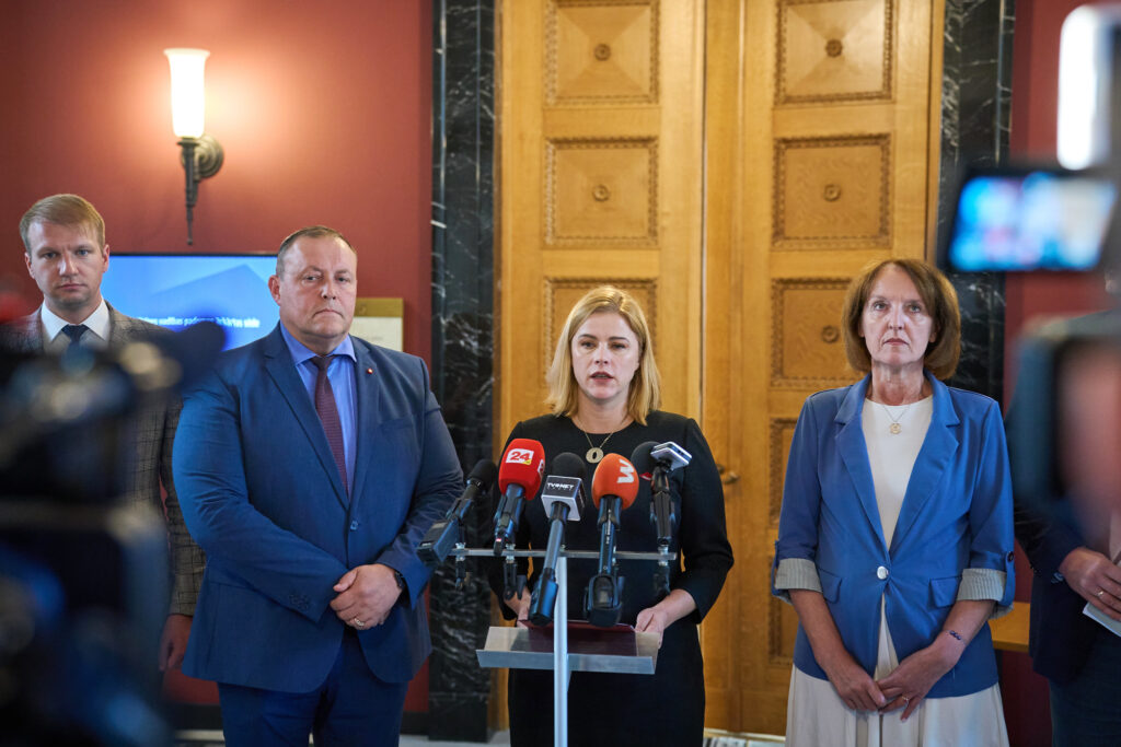 Attēlā – pēc Krīzes vadības padomes ārkārtas sēdes: (no labās) VARAM ministre Inga Bērziņa, premjerministre Evika Siliņa un iekšlietu ministrs Rihards Kozlovskis. Foto: Valsts kanceleja.