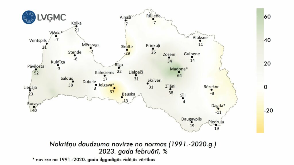 Vidējais nokrišņu daudzums Latvijā februārī bija 45,6 milimetri jeb 113% no normas. Visvairāk nokrišņu – 75,7 milimetri – bija Madonā, bet vismazāk lija un sniga Jelgavas novērojumu stacijā, kur nokrišņu summa nepārsniedza 22 milimetrus.