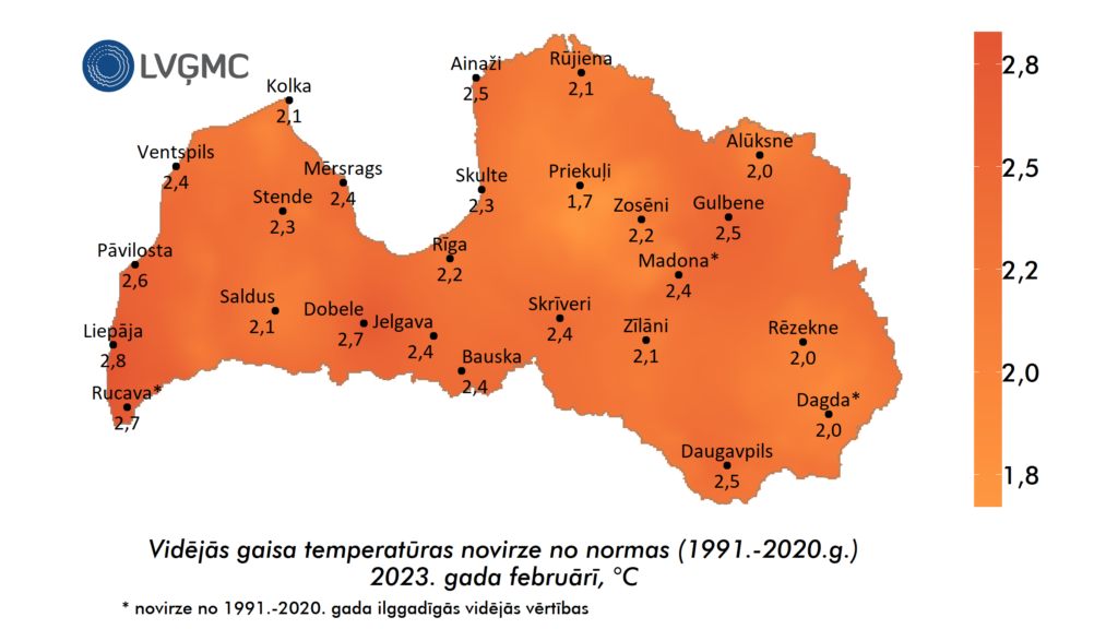 Februāra vidējā gaisa temperatūra Latvijā bija -0,8 grādi jeb 2,3 grādi virs mēneša normas, liecina Latvijas Vides, ģeoloģijas un meteoroloģijas centra apkopotā informācija.