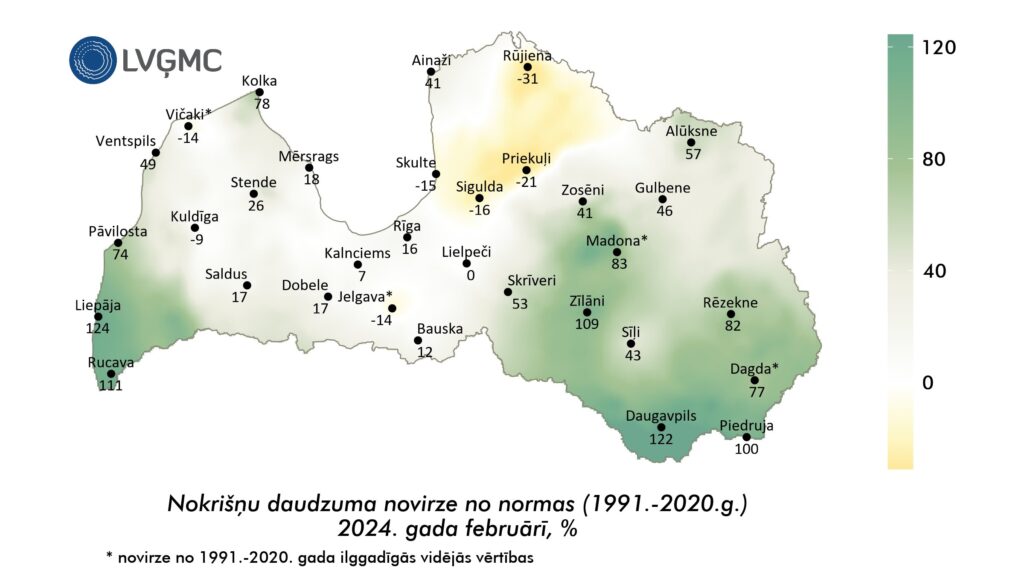 Vidējais nokrišņu daudzums Latvijā februārī bija 56,5 milimetri jeb 140% no normas. Visvairāk nokrišņu – 95,1 milimetrs – bija Rucavā, bet vismazāk lija un sniga Rūjienā, kur reģistrēti 27,4 milimetri nokrišņu. Liepājā, Rucavā, Jēkabpilī un Daugavpilī nokrišņu daudzums februārī vairāk nekā divas reizes pārsniedza normu.