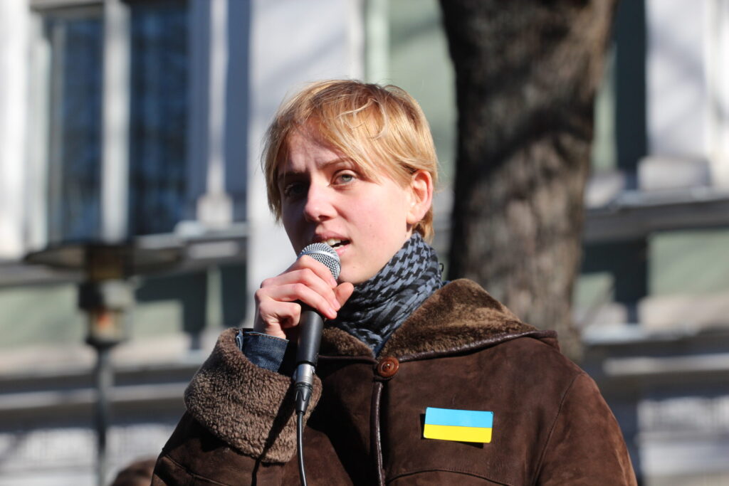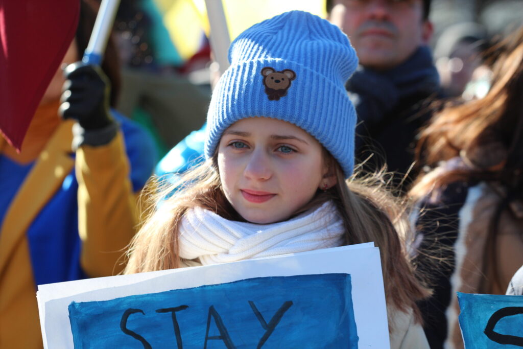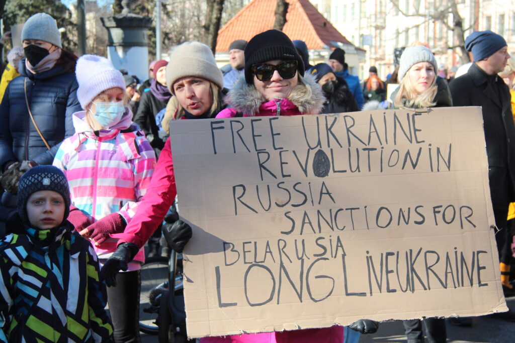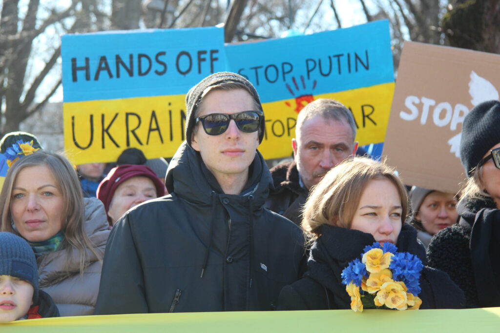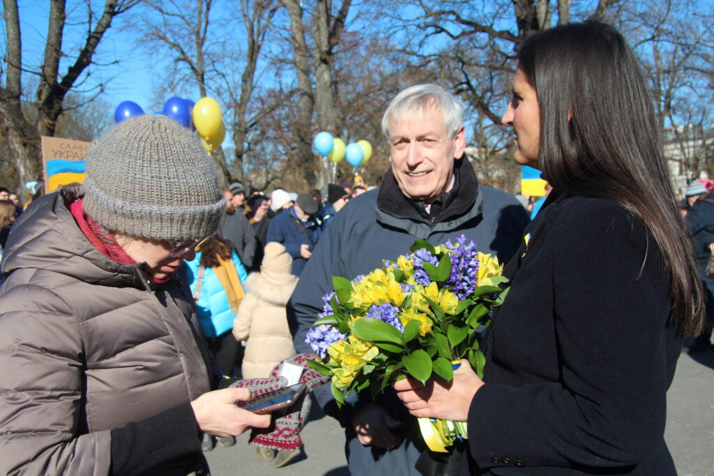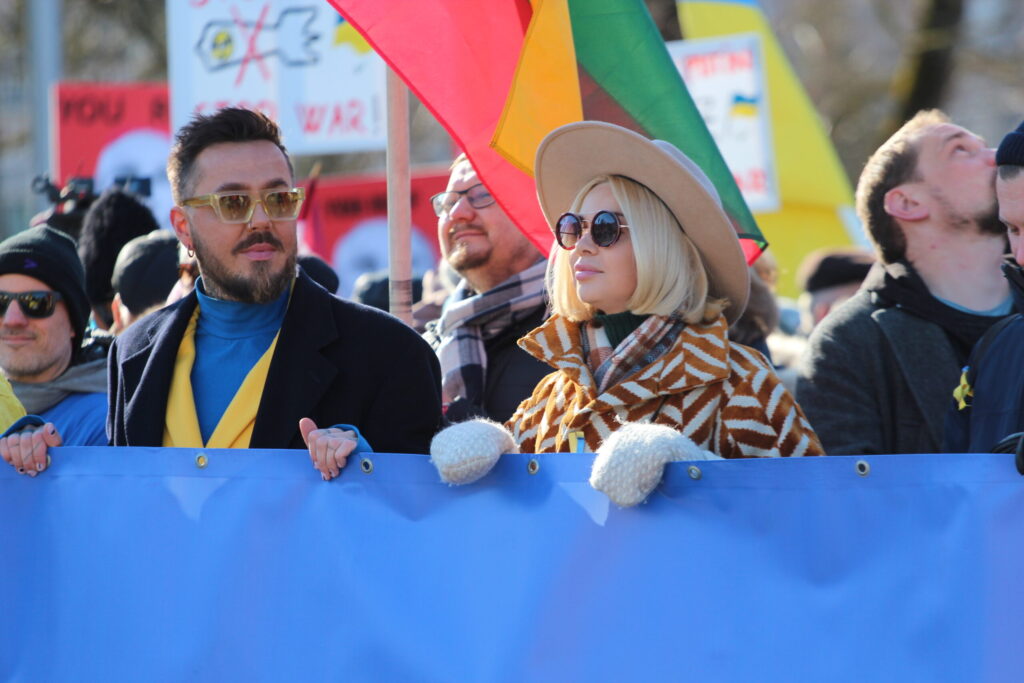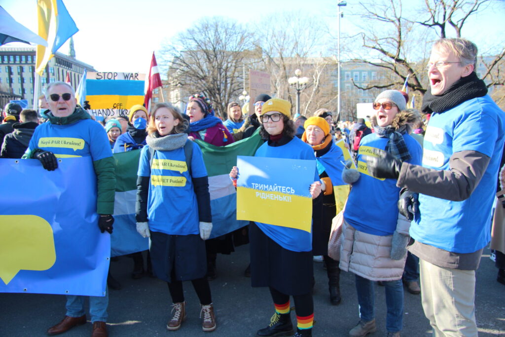 Uz neilgu laiku dalībnieki apstājās pie Krievijas vēstniecības, lai skandētu “Rokas nost no Ukrainas!”, bet pēc tam turpināja doties uz Ukrainas vēstniecību, pie kuras uzstādīta skatuve muzikālajiem priekšnesumiem un runām.