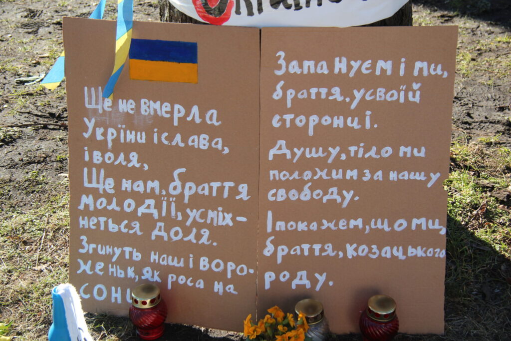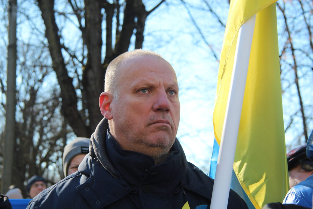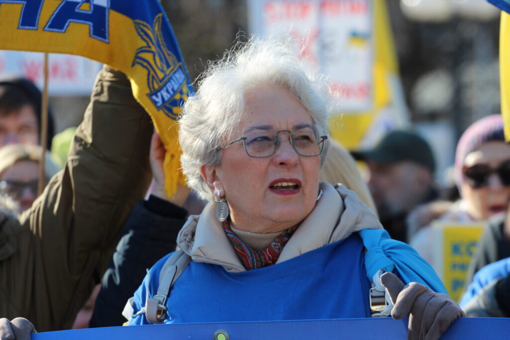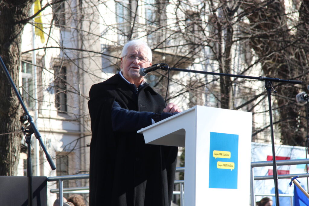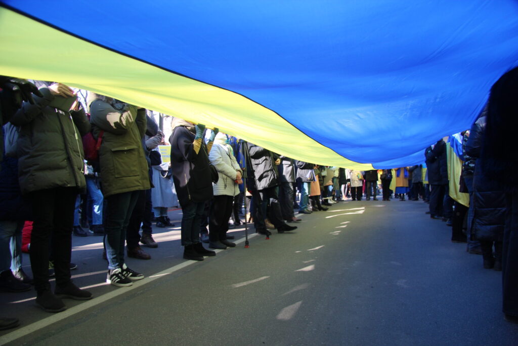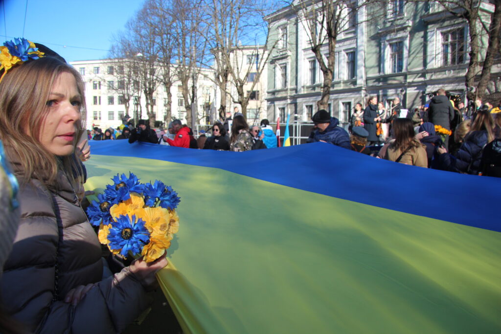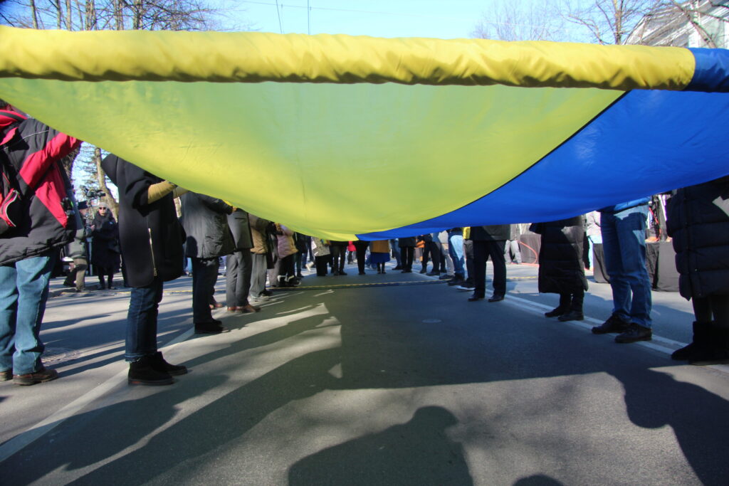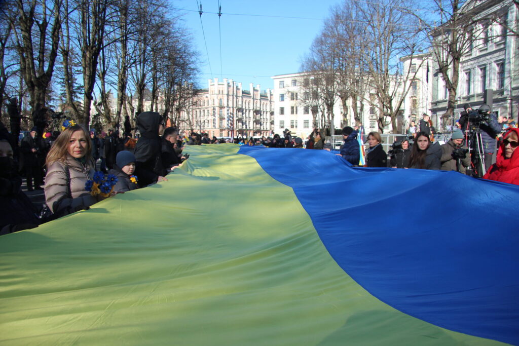 Mītiņā tika turēts arī vairāk nekā desmit metrus garš Ukrainas karogs.