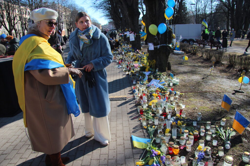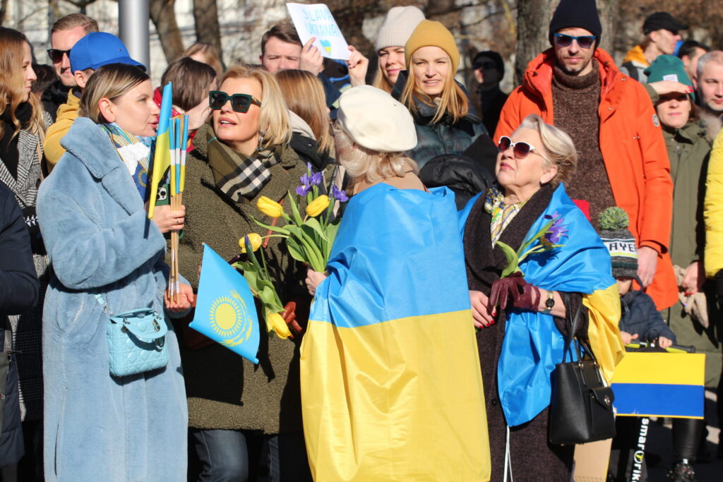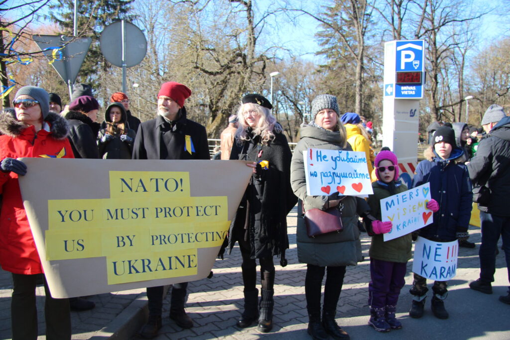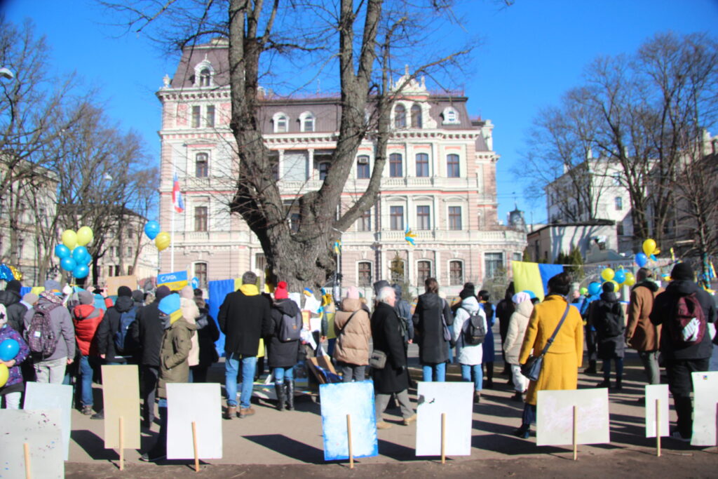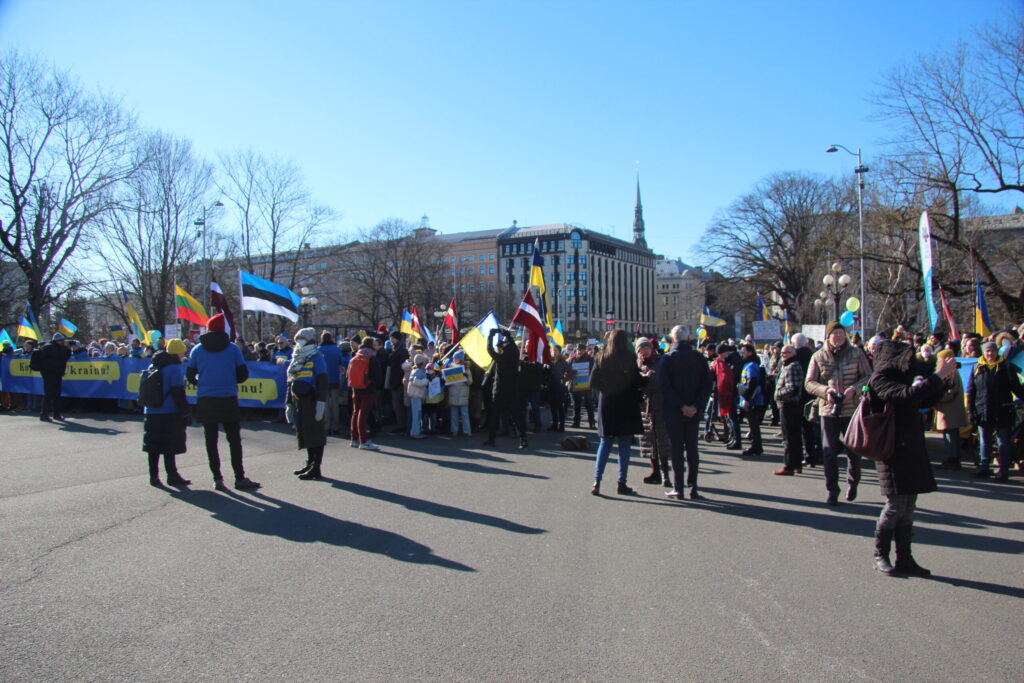 Ap plkst.11 cilvēki pulcējās pie Brīvības pieminekļa un skandēja dažādus saukļus, tai skaitā “Brīvību Ukrainai!”. Daudzi bija ieradušies gan ar Ukrainas karogiem, gan ziediem, baloniem, plakātiem Ukrainas karoga krāsās, tāpat daļa savā apģērbā izmantojusi karoga dzelteno un zilo krāsu.