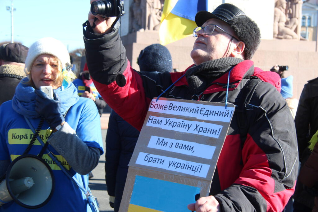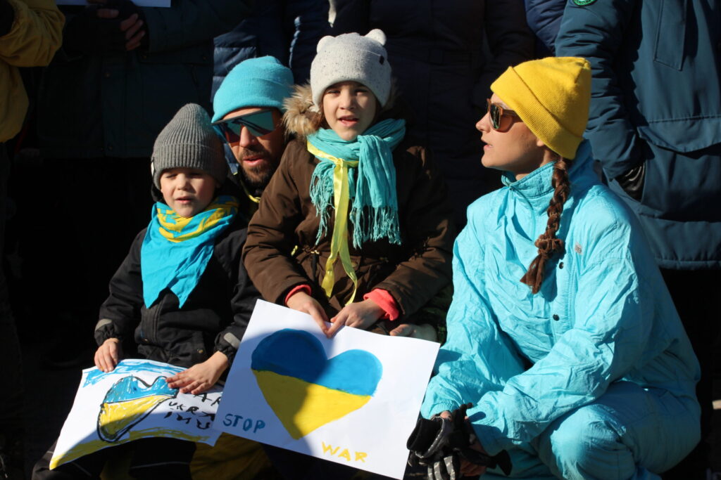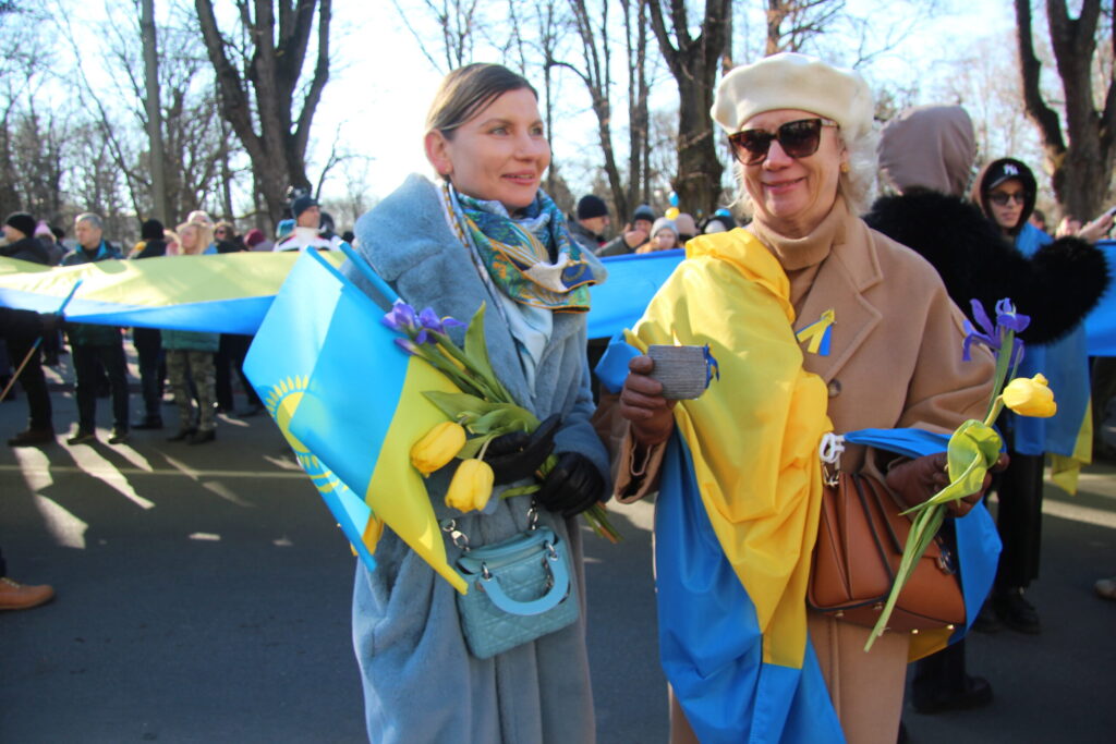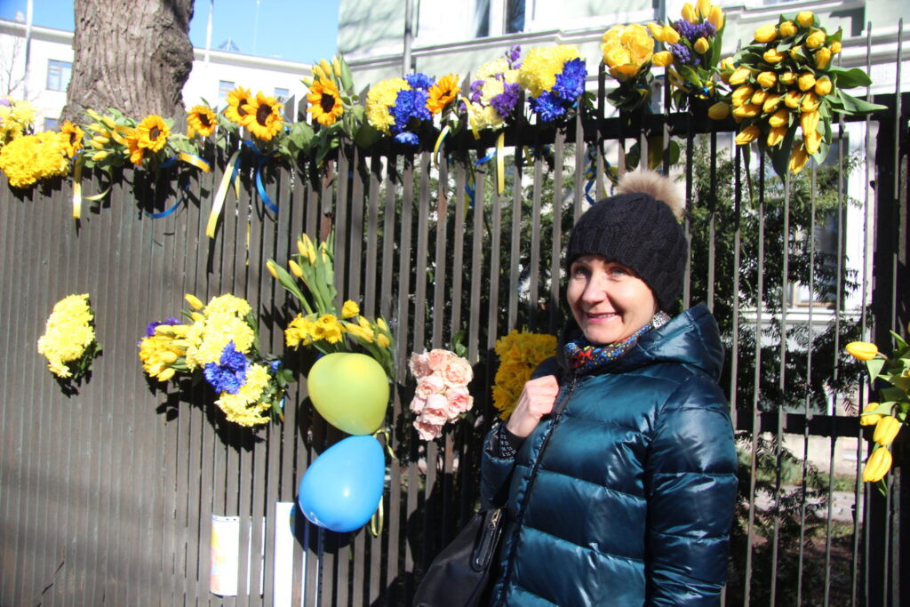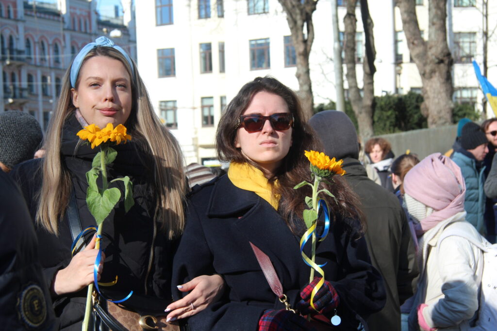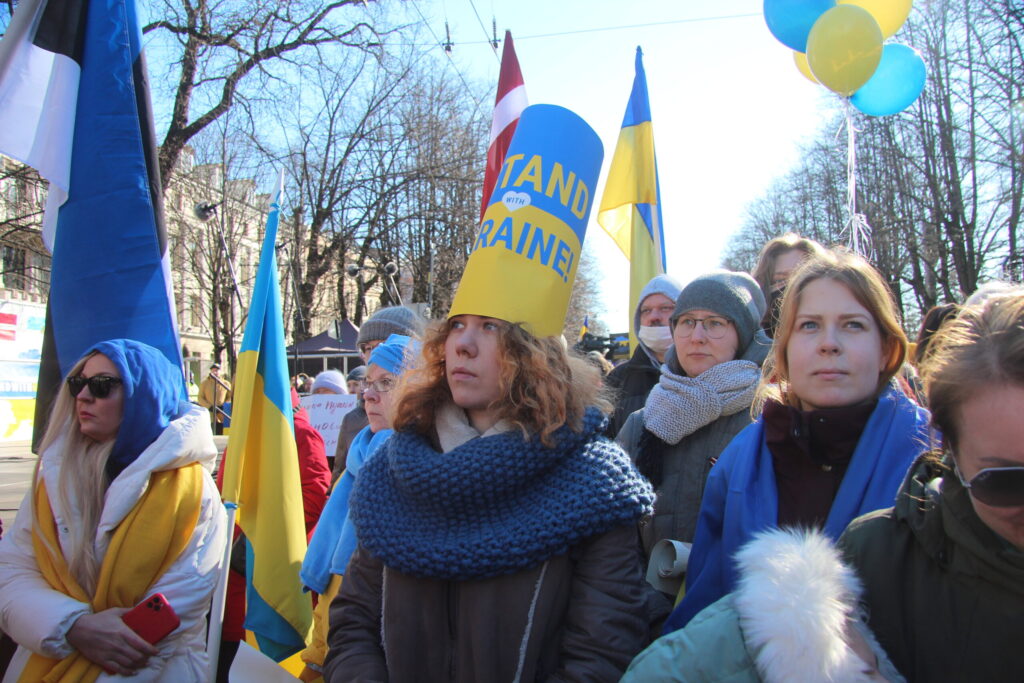 Ap plkst.11 cilvēki pulcējās pie Brīvības pieminekļa un skandēja dažādus saukļus, tai skaitā “Brīvību Ukrainai!”. Daudzi bija ieradušies gan ar Ukrainas karogiem, gan ziediem, baloniem, plakātiem Ukrainas karoga krāsās, tāpat daļa savā apģērbā izmantojusi karoga dzelteno un zilo krāsu.