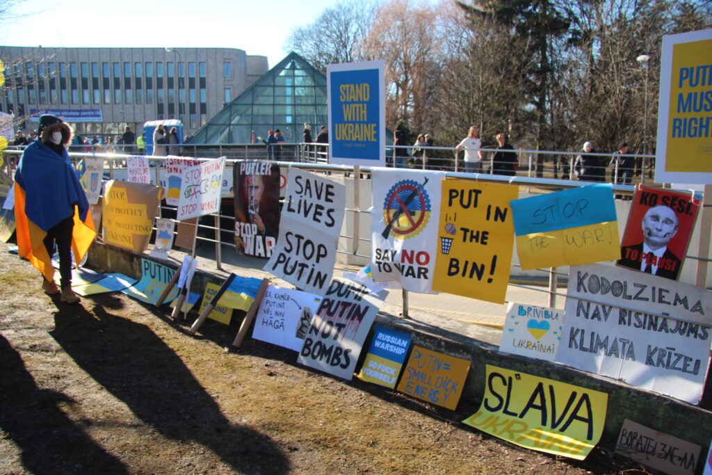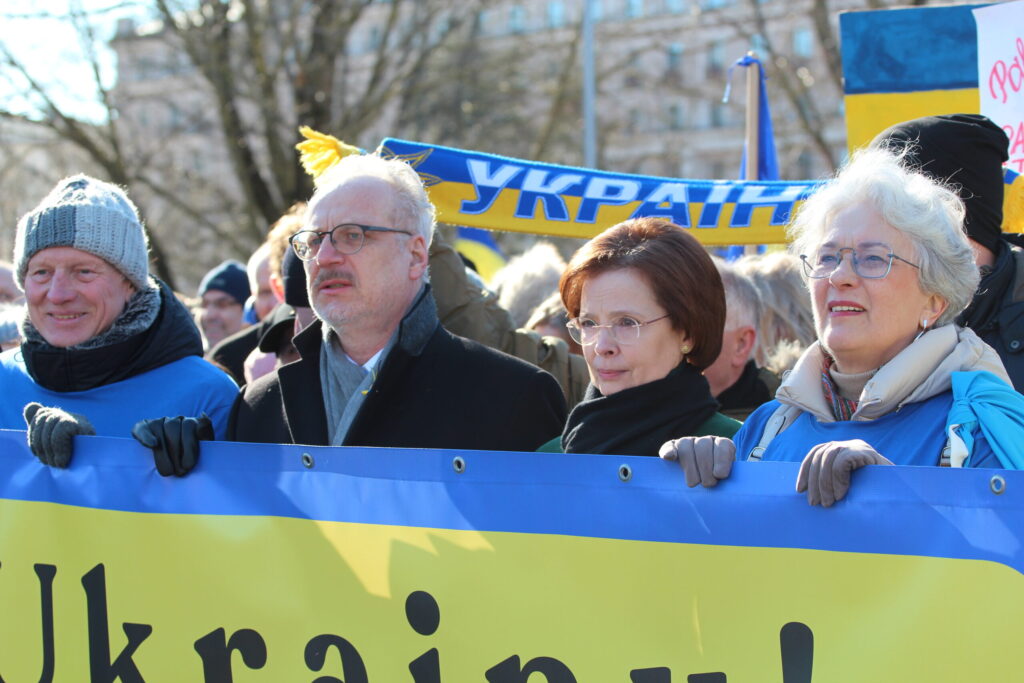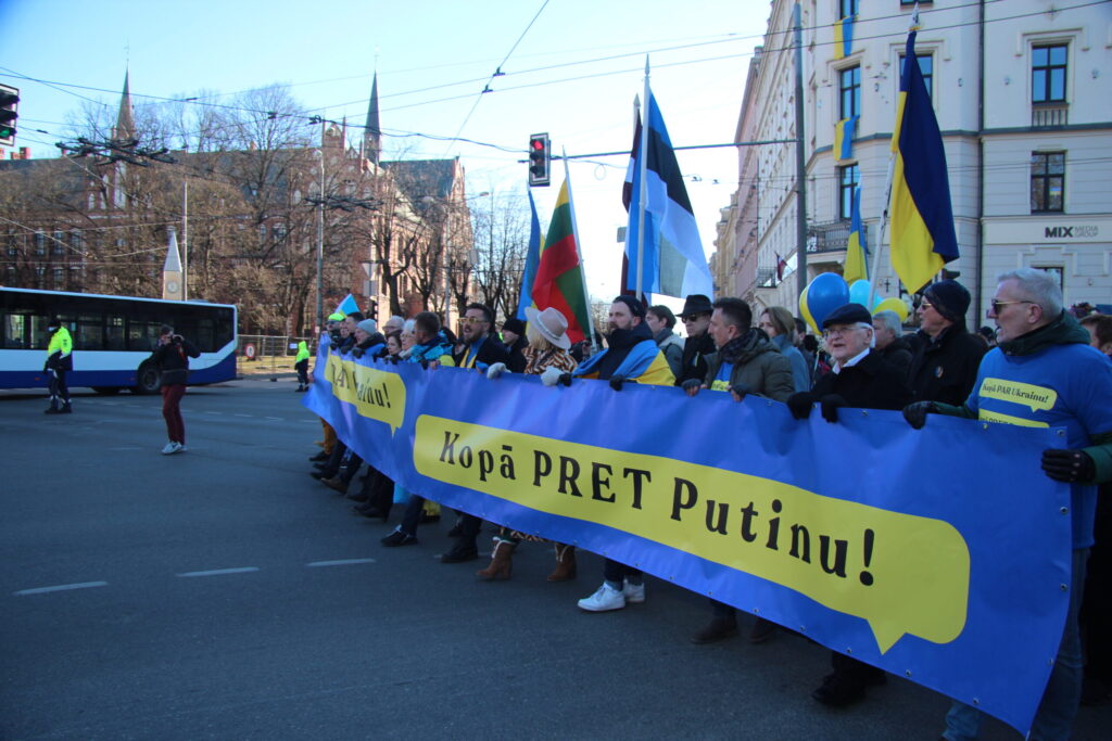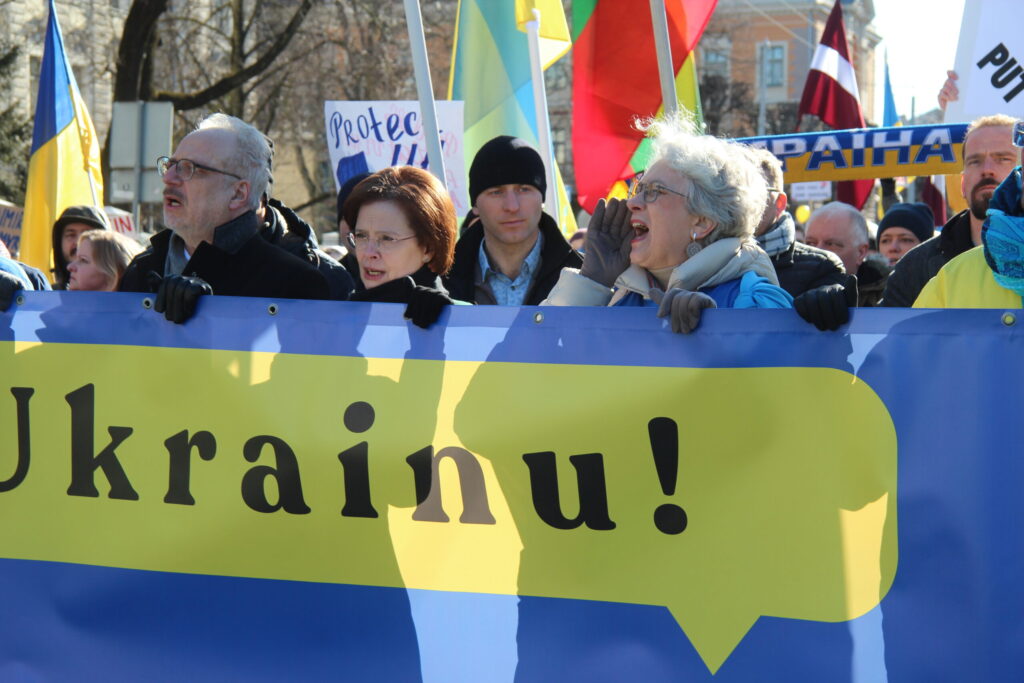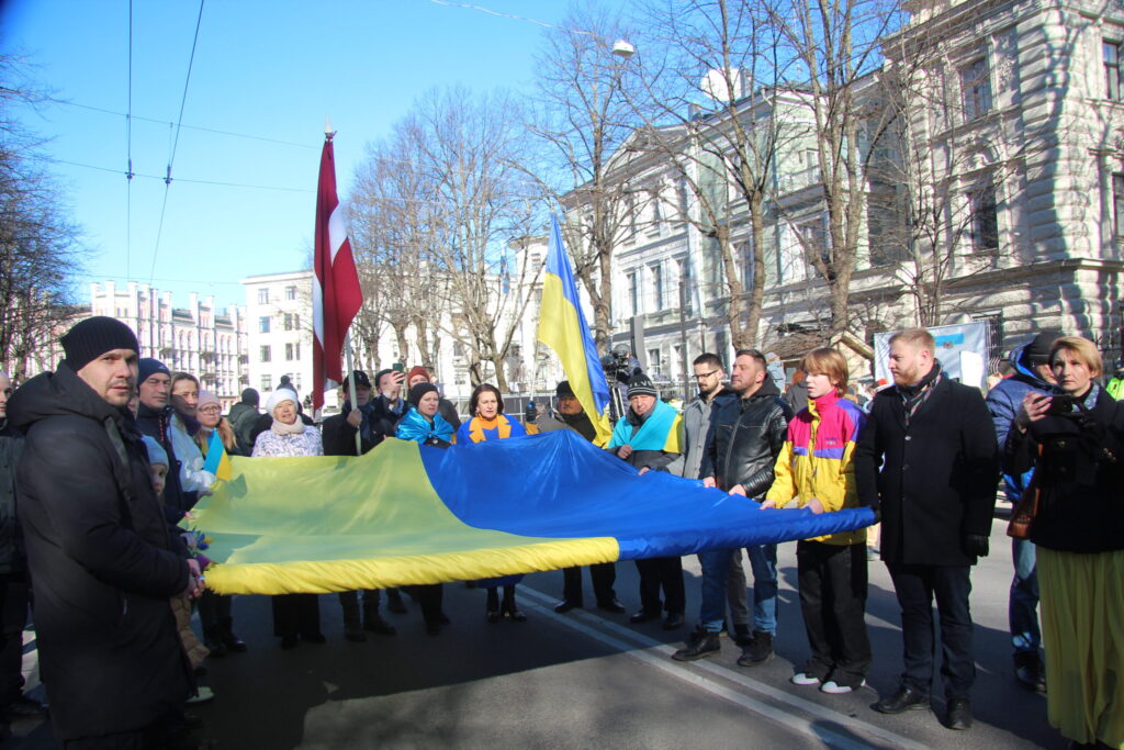 Gājiens uz Ukrainas vēstniecību atbalsta paušanai notika, dalībniekiem ukrainiski skandējot “Slava Ukranai! Varoņiem slava!” un latviski “Putinu uz Hāgu!”.