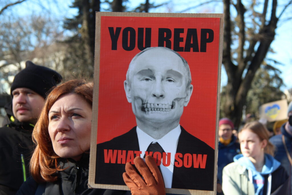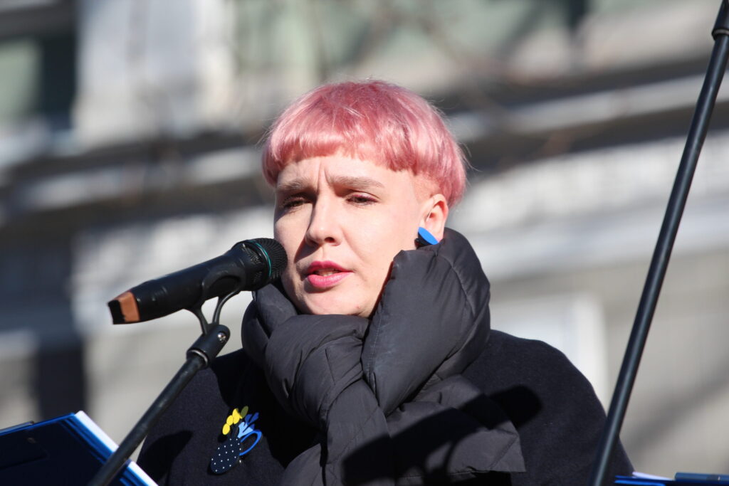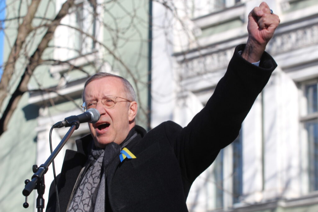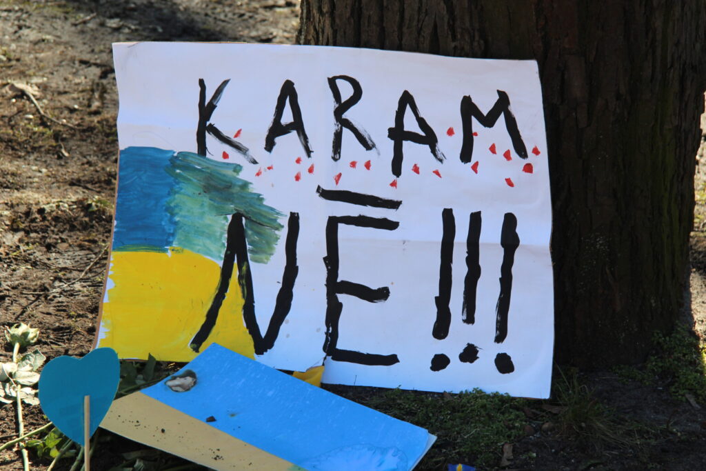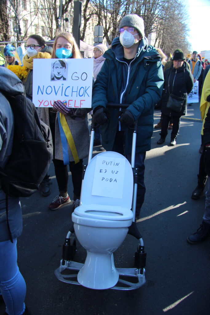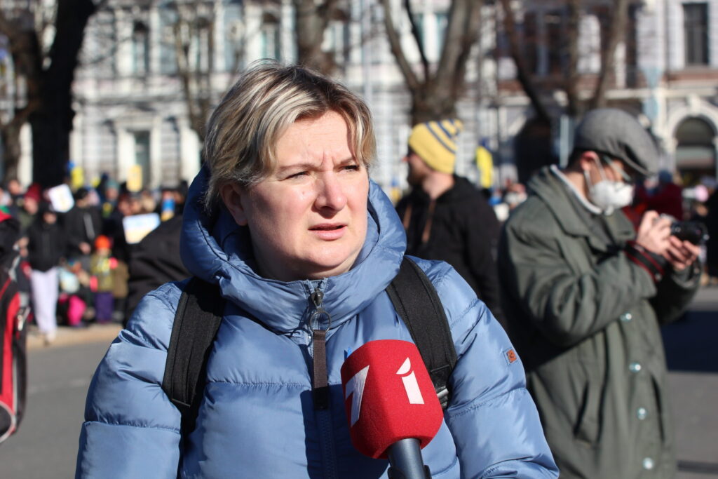 Gājiens uz Ukrainas vēstniecību atbalsta paušanai notika, dalībniekiem ukrainiski skandējot “Slava Ukranai! Varoņiem slava!” un latviski “Putinu uz Hāgu!”.