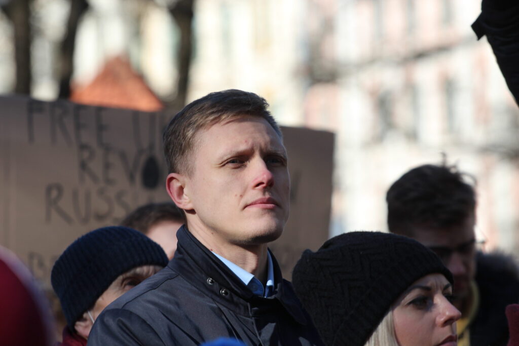 Mītiņā tika vests arī krātiņš jeb “cietuma kamera”, kurā ievietota Putinam līdzīga lelle.