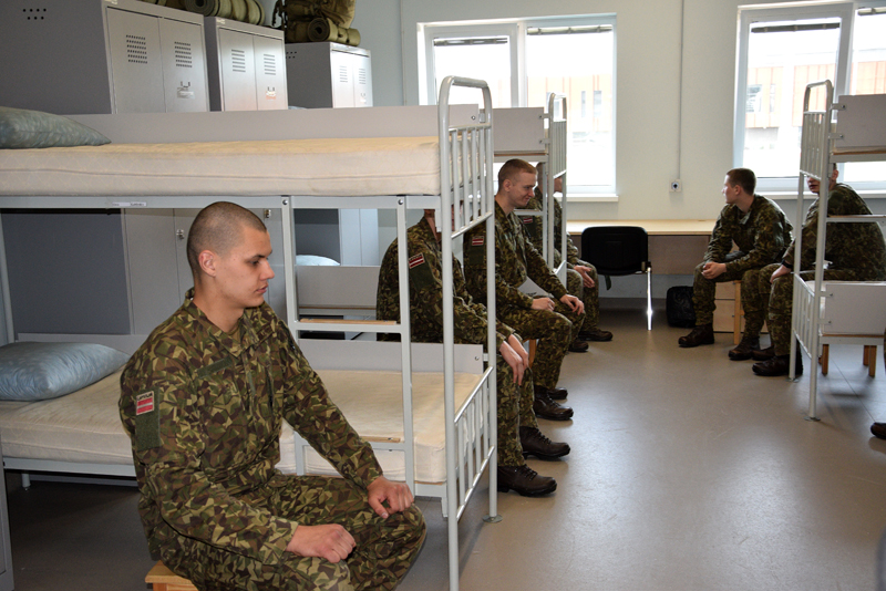 Pirmais apskates objekts bija kazarmas, kurās mitināsies valsts aizsardzības dienesta karavīri. Paredzēts, ka vienā istabā dzīvos 10 VAD karavīri. Jauniešiem tiks nodrošināts viss nepieciešamais ikdienas sadzīvē.