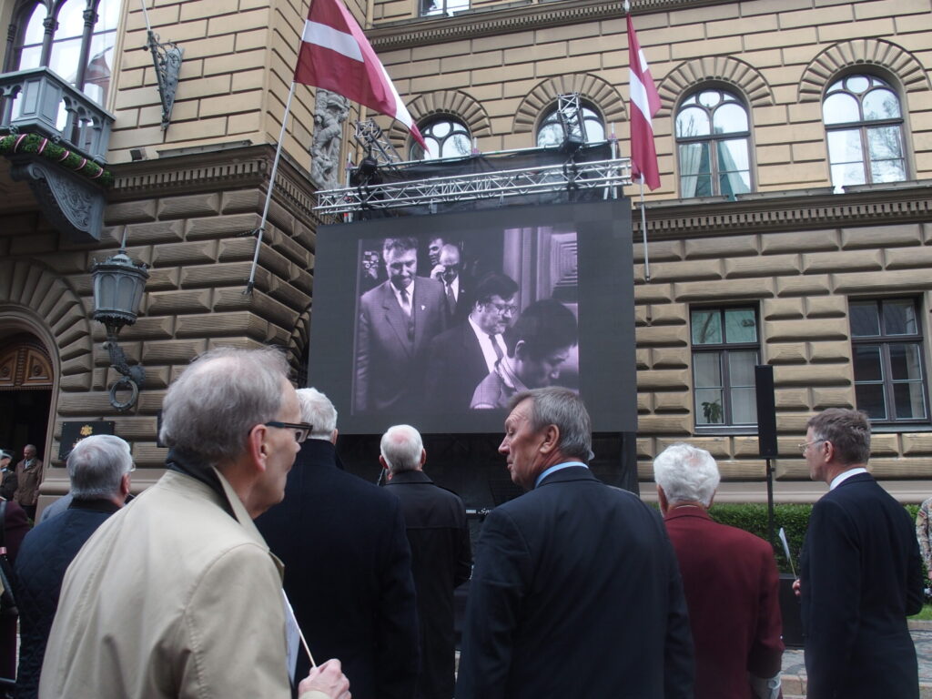 Pie Saeimas nama. Plkst. 12.00 Saeimā notika svinīgā sēde, kuru bija iespējams vērot tiešraidē ārtelpā. Plkst. 13.15 tika godināti Augstākās padomes deputāti, bet plkst. 13.30 sākās svinīga ceremonija Baltijas valstu vienotības un solidaritātes ar Ukrainu apliecināšanai, kurā bija skatāma arī tematiskā izstāde par Latvijas neatkarības atjaunošanas 35. gadadienu. Daudziem acīs sariesās asaras, vērojot kino un foto arhīvu – 1990.gada 4.maija satraucošos notikumus.