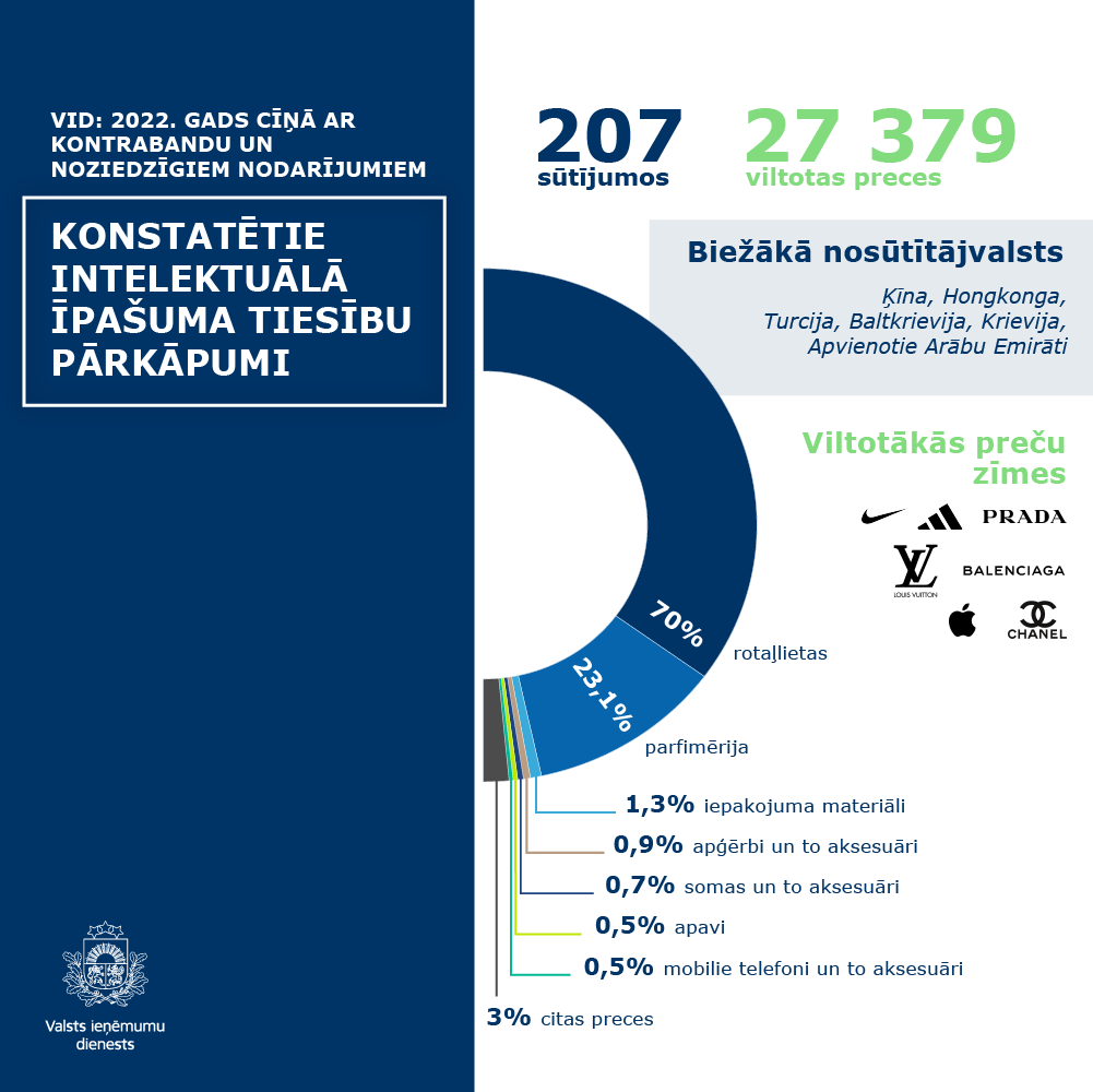Valsts ieņēmumu dienesta (VID) Muitas pārvaldes amatpersonas, veicot kravu un sūtījumu kontroli, 2022.gadā kopumā 207 gadījumos atklāja 27 379 vienības viltotu preču. 70 % no visām viltotajām precēm bija rotaļlietas, 23 % – parfimērijas izstrādājumi, bet pārējās bija apģērbi, apavi, somas, mobilie telefoni un citas preces, portālu informēja Valsts ieņēmumu dienestā.