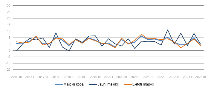 2023. gada 3. ceturksnī, salīdzinot ar 2023. gada 2. ceturksni, mājokļu cenas samazinājās par 0,9 %. Jauniem mājokļiem cenas krita par 0,2 %, un lietoti mājokļi bija par 1,2 % lētāki.