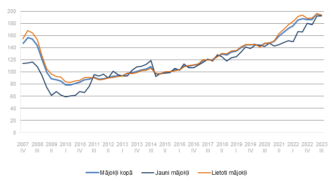 Salīdzinot ar 2015. gadu, mājokļu cenas 2023. gada 3. ceturksnī bija par 93,7 % augstākas. Jauniem mājokļiem cenas pieauga par 92,3 %, bet lietotiem mājokļiem – par 94,1 %.
