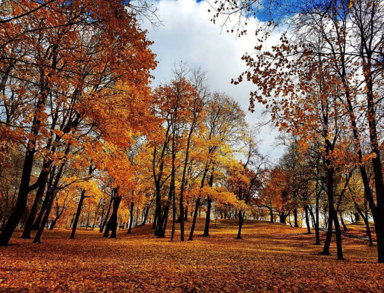 Saulrieta laikā apkārtējo koku dzeltenās lapas mirdz kā ugunī.