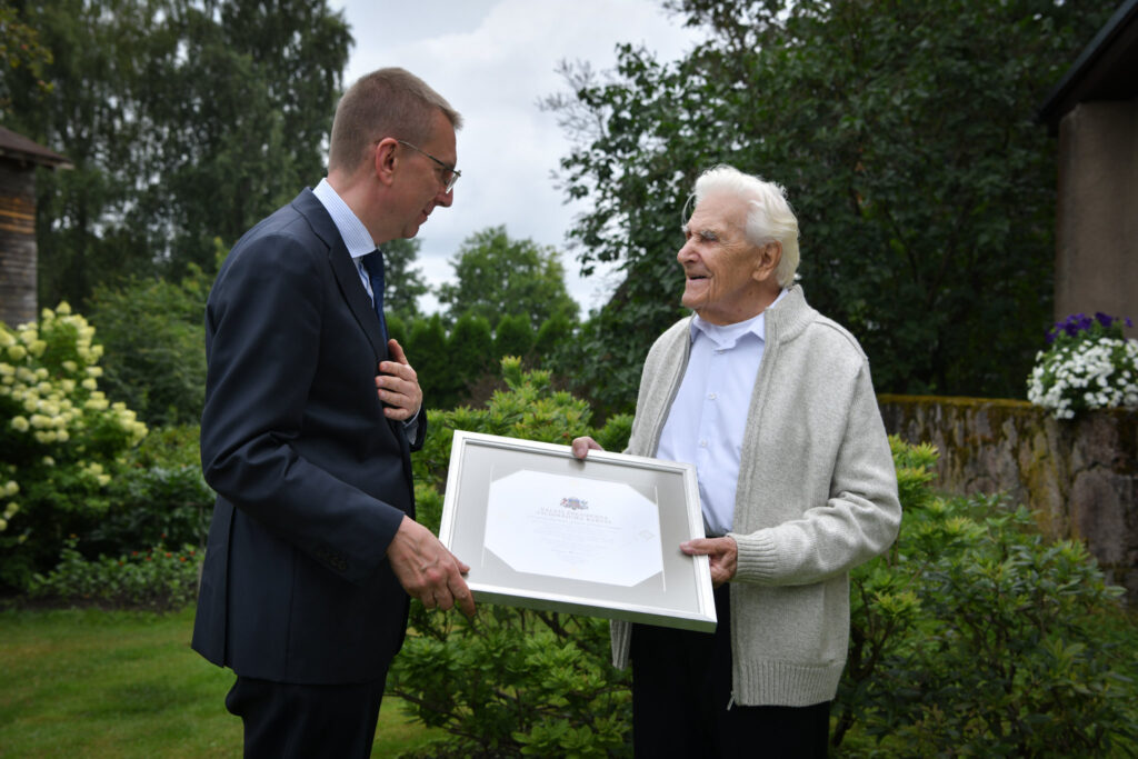 Valsts prezidents Edgars Rinkēvičs pasniedz Cildinājuma rakstu Jānim Kubilim. Foto: Ilmārs Znotiņš, Valsts prezidenta kanceleja.