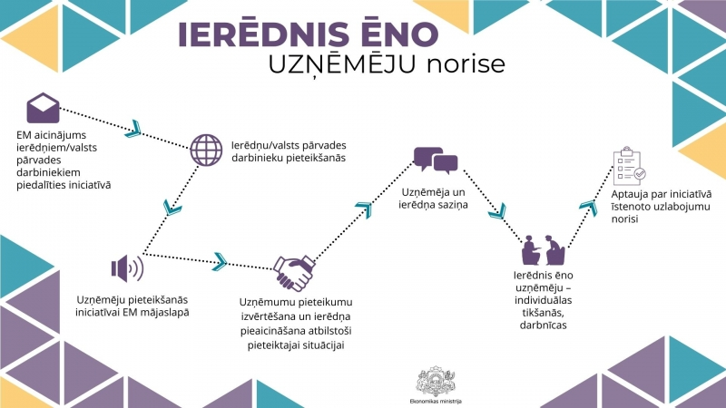 Dalība iniciatīvā “Ierēdnis ēno uzņēmēju” ir uzņēmēja papildu iespēja saņemt individuālas konsultācijas un atbalstu no valsts puses. Uzņēmējs iniciatīvas laikā var pieteikt savu ideju vai problēmjautājumu un nepastarpināti piedalīties tā risināšanā sadarbībā ar atbildīgo valsts pārvaldes darbinieku. Uzņēmējs var izvēlēties ēnošanai vairākus ierēdņus, kuri vienlaicīgi apmeklēs uzņēmumu, skaidro Ekonomikas ministrijas Sabiedrisko attiecību nodaļa. Savukārt valsts pārvaldes darbiniekam dalība iniciatīvā ir iespēja iepazīties ar uzņēmēja ikdienas darba pieredzi un izaicinājumiem, kā arī novērtēt savas iestādes veidotā regulējuma piemērošanu praksē. Sadarbībā ar partneriem plānota arī uzņēmēju un ierēdņu dalība LTRK tematiskajās grupās, lai kopīgi izstrādātu jaunu Uzņēmējdarbības vides uzlabošanas plānu. Dalību būs iespējams norādīt jau pieteikumā, kā arī pievienoties visu iniciatīvas norises laiku. Tādējādi uzņēmējiem ir iespēja izvēlēties ērtāko formātu.