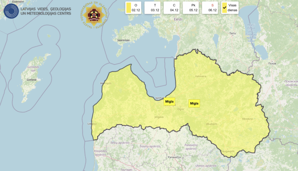 Izplatīts dzeltenais brīdinājums par biezu miglu