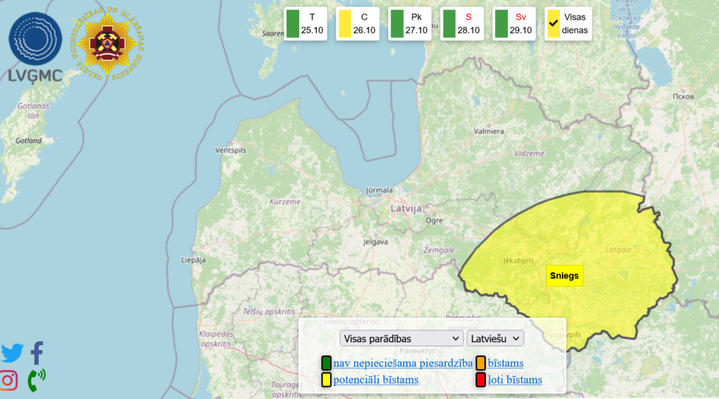 Latvijas vides, ģeoloģijas un meteoroloģijas centrs (LVĢMC) izplatījis dzelteno brīdinājumu par ilgstošu snigšanu Latvijas dienvidaustrumu rajonos.