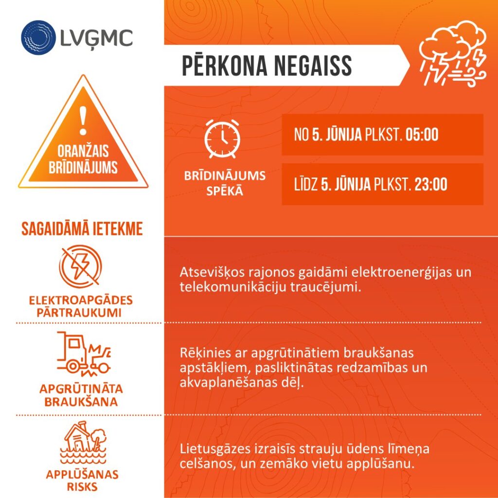 Pērkona negaisa brīdinājums ir spēkā no 5. jūnija pulksten 5 līdz pulksten 23.