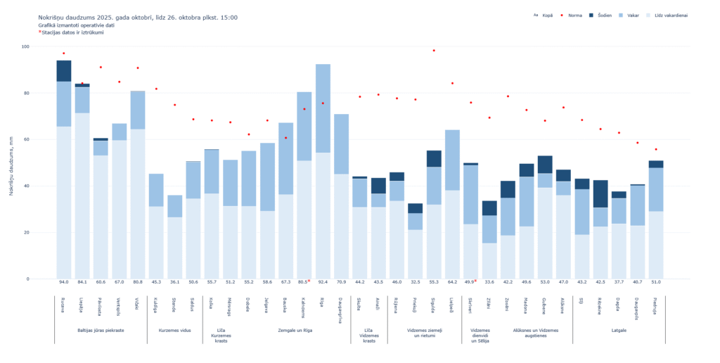 Šīs nedēļas izskaņā laikapstākļus noteica ciklons, kura ietekmē lija teju visā valsts teritorijā. Vislielākais nokrišņu daudzums galvenokārt reģistrēts novērojumu stacijās valsts centrālajā daļā. Jaunās darba nedēļas sākumā laiks saglabāsies lietains, bet nedēļas izskaņā kļūs sausāks. Tuvākajās dienās gaisa temperatūra naktīs būs +2…+7 grādu robežās, bet dienās termometra stabiņš nepārsniegs +10 grādu atzīmi, savukārt nedēļas nogalē laiks kļūs vēsāks, prognozē Latvijas Vides, ģeoloģijas un meteoroloģijas centrs (LVĢMC).