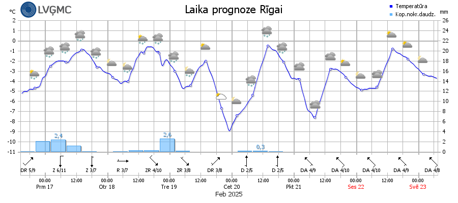 Saskaņā ar sinoptiķu prognozēm pirmdien un otrdien teritorijas lielākajā daļā snigs, intensīvākā snigšana gaidāma tieši rietumu un centrālajos rajonos. Naktī uz pirmdienu vietām sniega segas palielināsies par 5-8 cm, taču kā dienas laikā, tā arī otrdien tā pieaugs vēl par vairākiem centimetriem. Snigšanas laikā redzamība pasliktināsies, ceļi būs sniegoti un slideni, kas apgrūtinās braukšanas apstākļus. Šonakt piekrastē ziemeļrietumu, rietumu vējš kļūs brāzmaināks. Termometra stabiņš naktī noslīdēs līdz -7…-13 grādiem, rietumos un piekrastē līdz 0…-6 grādiem, savukārt dienā gaiss iesils līdz +1…-5 grādiem.