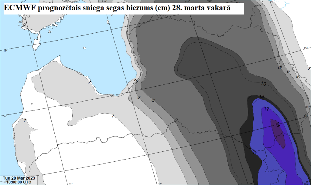 Arī otrdien debesis lielākoties aizklās mākoņi, vienīgi nakts sākumā brīžiem tās skaidrosies. Uz rīta pusi Latvijas teritoriju no dienvidaustrumiem sasniegs ciklons, kas nesīs stiprus un ilgstošus nokrišņus, austrumu un centrālajos rajonos galvenokārt sniegu. Daudzviet no jauna izveidosies sniega sega, tās biezums valsts centrālajos un austrumu rajonos sasniegs 5-9 centimetri, lokāli austrumos sniega kārta var būt vēl biezāka, pārsniedzot pat 10-14 centimetrus.