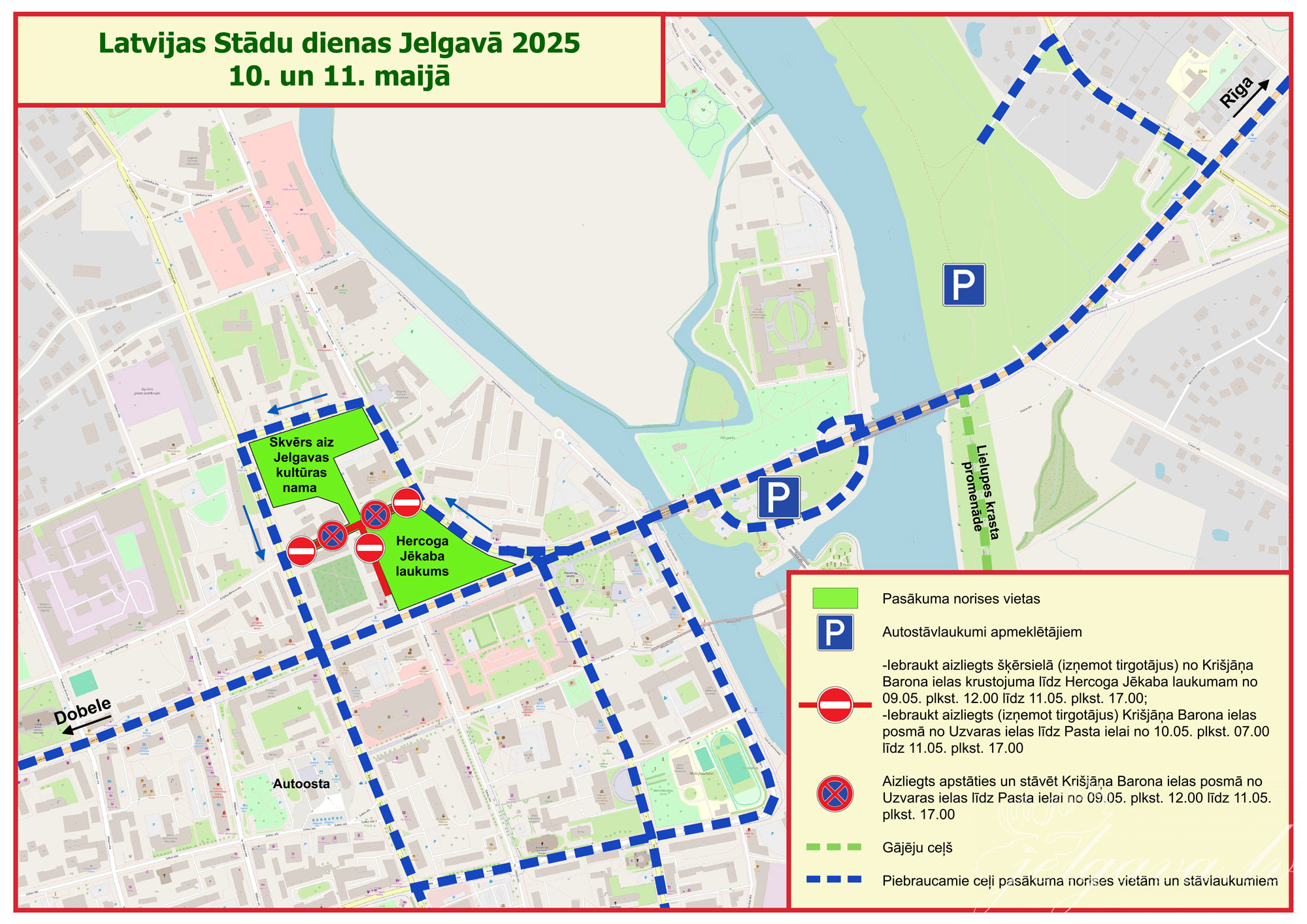 Iedzīvotājiem jāņem vērā, ka jau no piektdienas, 9. maija, pulksten 12 Hercoga Jēkaba laukuma apkārtnē būs noteikti satiksmes ierobežojumi, bet sestdien un svētdien slēgta Krišjāņa Barona iela no Pasta līdz Uzvaras ielai.