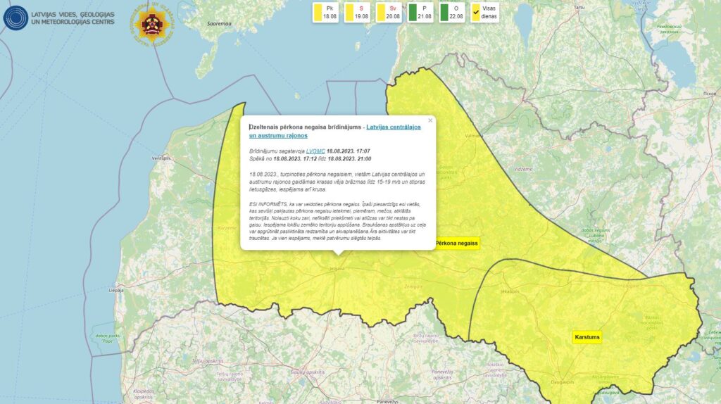 Daudzviet Latvijā, galvenokārt valsts centrālajos un dienvidaustrumu novados, sinoptiķi izsludinājuši dzeltenās krāsas brīdinājumu par pērkona negaisu ar stiprām lietusgāzēm, krasām vēja brāzmām līdz 19 metriem sekundē un varbūtēju krusu. Šis brīdinājums piektdienas vakarā spēkā arī Rīgā.