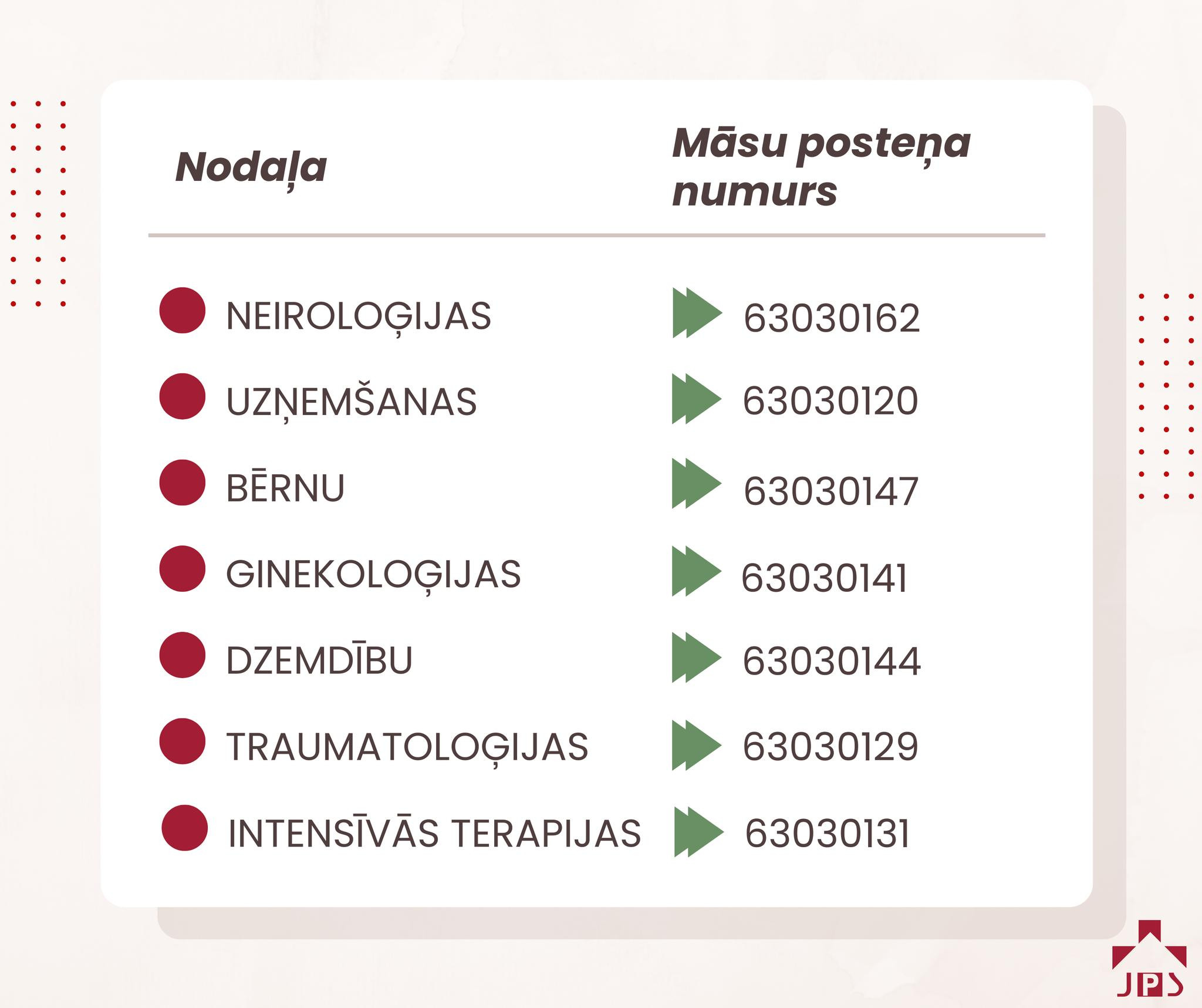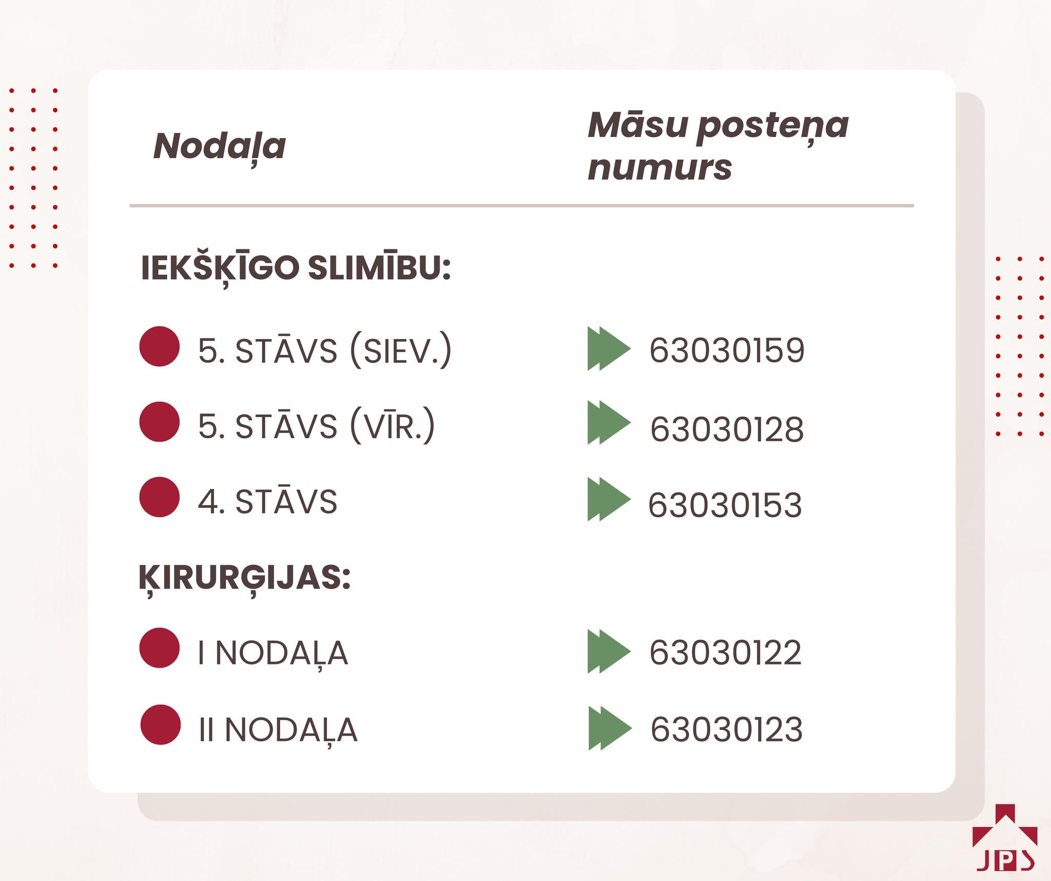 Vizīti lūgums pieteikt, zvanot uz nodaļu māsu posteņu tālruņiem.