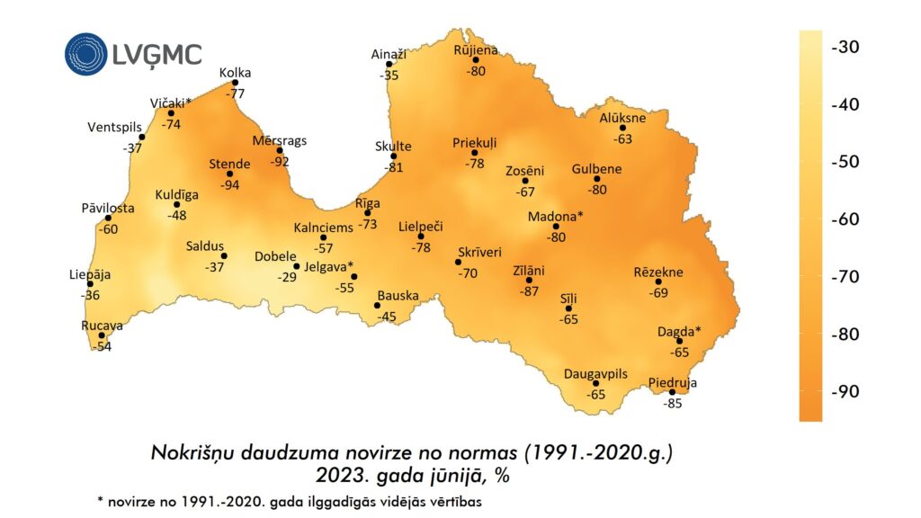Valstī vidēji jūnijā bija 23,4 milimetri lietus jeb 33% no normas. Sausākā jūnija rekords pieder 1969.gadam, kad nokrišņu daudzums bija 21,6 milimetri.