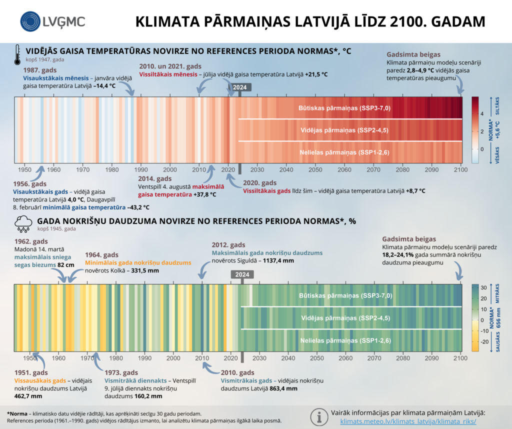 Vairāk par Latvijas klimatu un klimata modeļu nākotnes scenārijiem var uzzināt Klimata pārmaiņu rīkā, kā arī ziņojumā “Līdzšinējās un nākotnes klimata pārmaiņas Latvijā”.