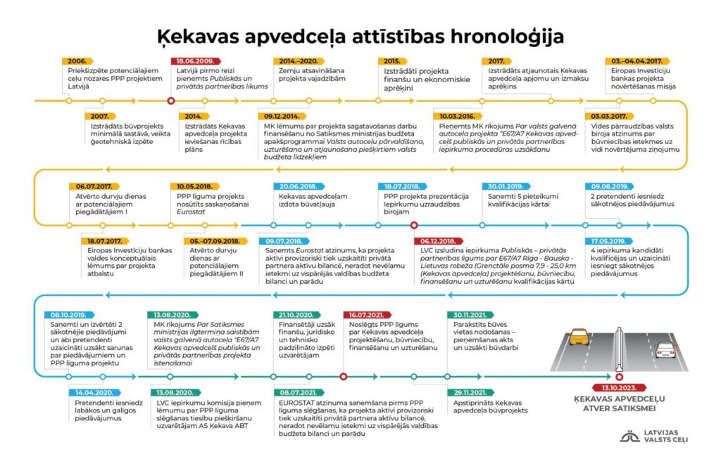 Jau ziņots, ka Ķekavas apvedceļa būvdarbus bija plānots pabeigt līdz 2023.gada beigām, savukārt ceļa uzturēšanu privātais partneris veiks vēl 20 gadus pēc būvdarbu pabeigšanas, līdz ar ko visa PPP projekta pabeigšana plānota 2043.gadā.
