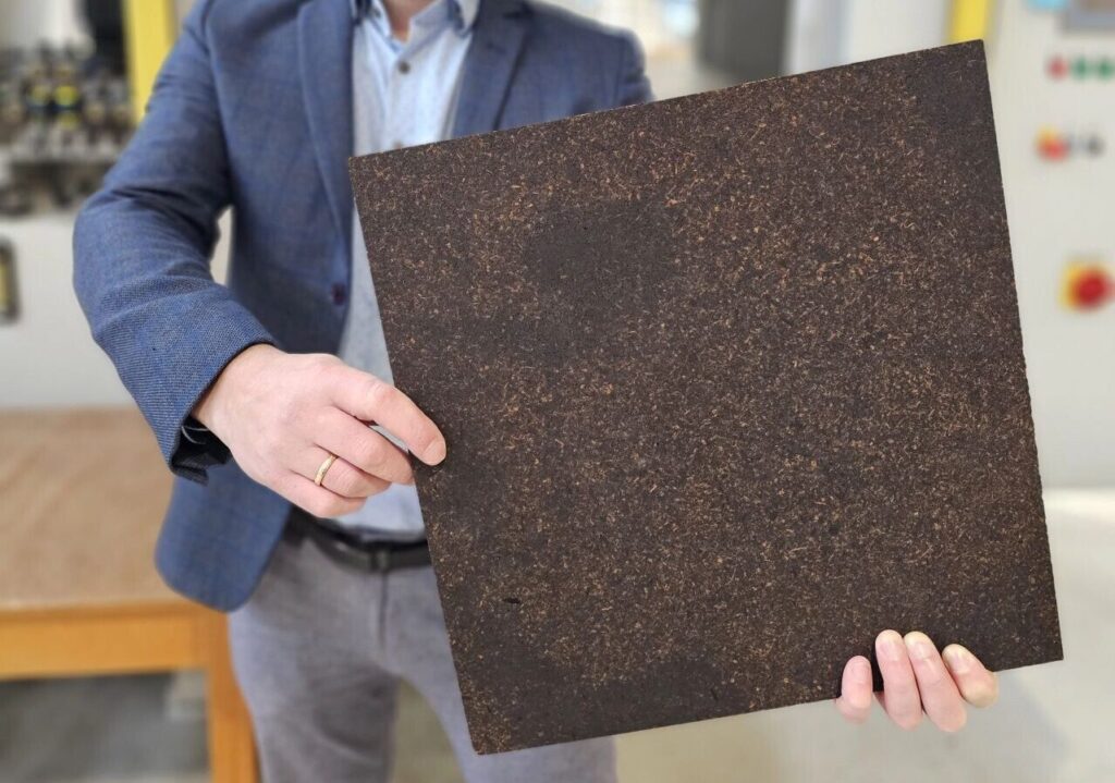 Pilotiekārtā izgatavota blīva, mitrumizturīga plātne no dabiskām izejvielām, kas ļauj atteikties no sintētiskajiem materiāliem ikdienas dzīvē un padarīt ēkas ekoloģiskākas, saudzējot vidi un cilvēku veselību.