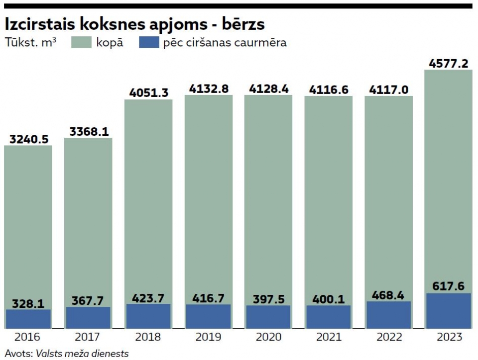 2023. gadā pēc ciršanas caurmēra tika iegūti 1,72 milj. m³ koksnes, kas ir 11,5% no kopumā iegūtajiem 15 milj. m³. Savukārt, 2022. gadā šādi tika iegūti 1,24 milj. m³ jeb 9,5% no kopumā iegūtajiem 13 milj. m³. Vēl mazāks īpatsvars no kopējās iegūtās koksnes (13 milj. m³) bija 2021. gadā, kad pēc caurmēra tika iegūti 1,03 milj. m³ jeb 7,9%. Jāatgādina, ka šī gada 8. aprīlī Satversmes tiesa pasludināja spriedumu lietā par normu, ar kuru tika veiktas izmaiņas galvenās cirtes caurmēra skaitliskajās vērtībās, un atzina, ka apstrīdētās normas pieņemšanas procesā nav ievērots ilgtspējības princips un piesardzības princips.