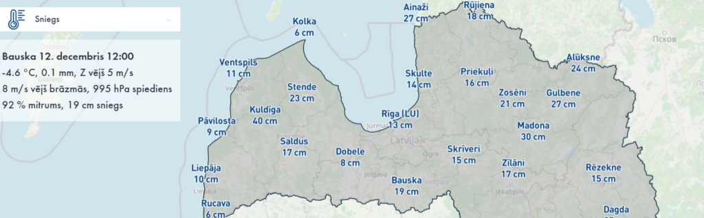 Pirmdien plkst.12 dziļākais sniegs valsts novērojumu stacijās bija 40 centimetri Kuldīgā, liecina Latvijas Vides, ģeoloģijas un meteoroloģijas centra dati.