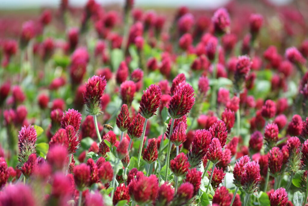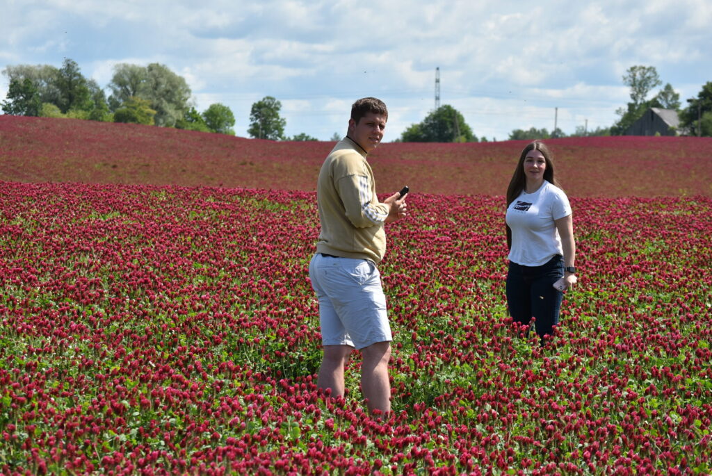 Kurzemes pusē šobrīd pilnos ziedos un tumši sarkanā tonī zied inkarnāta āboliņš, ziņo portāls liepajniekiem.lv.