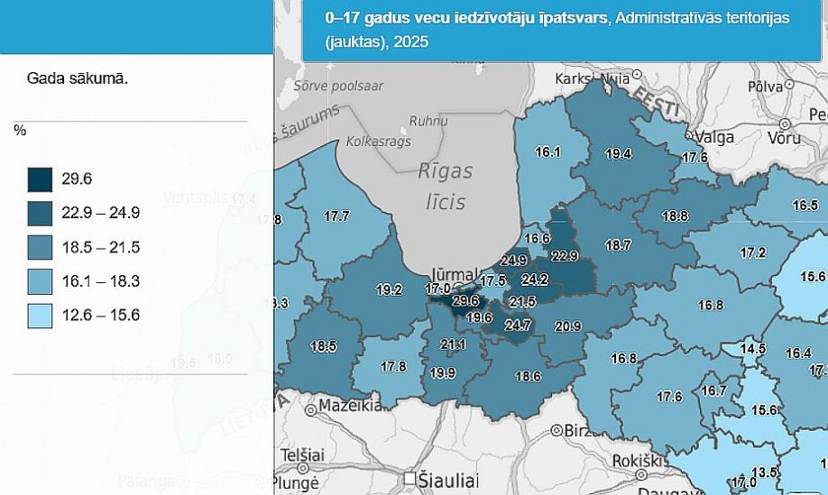 Vismazāk bērnu bija Latgales reģionā (15,9 %) – Krāslavas novadā (12,6 %), Augšdaugavas novadā (13,5 %) un Ludzas novadā (14,3 %). Kopš pērnā gada bērnu skaits samazinājās par 8,3 tūkstošiem jeb 2,4 %.