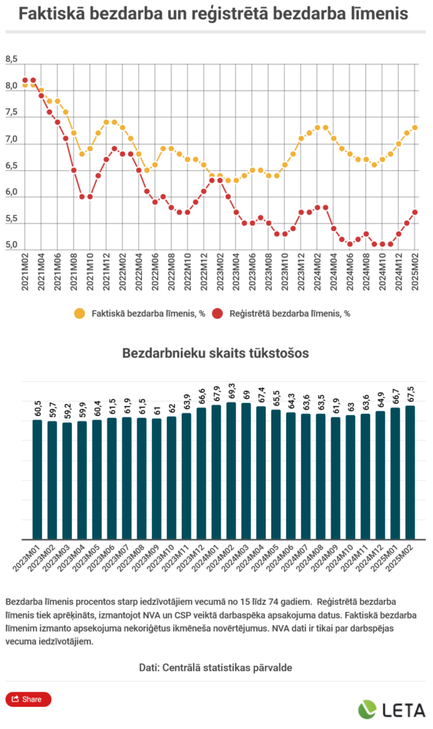 Februārī Latvijā bija 67 500 bezdarbnieku, kas ir par 800 vairāk nekā janvārī, bet par 1800 mazāk nekā 2024.gada februārī. Mēneša laikā vīriešu bezdarbnieku skaits palielinājies par 600, sasniedzot 40 900, kamēr bez darba esošo sieviešu skaits palielinājies par 200 – līdz 26 600.