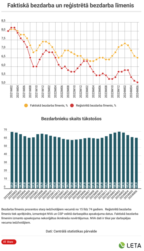 Vienlaikus statistikas pārvaldē norāda, ka Nodarbinātības valsts aģentūrā (NVA) reģistrētā bezdarba līmenis jūnijā samazinājās par 0,1 procentpunktu un mēneša beigās veidoja 5,1% no ekonomiski aktīvajiem iedzīvotājiem. Savukārt salīdzinājumā ar 2023.gada jūniju reģistrētā bezdarba līmenis ir samazinājies par 0,4 procentpunktiem.