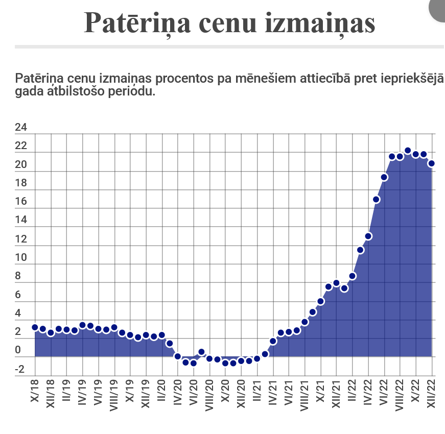 Vienlaikus 2022.gada decembrī Latvijā patēriņa cenas, salīdzinot ar novembri, samazinājās par 0,5%, bet gada laikā – 2022.gada decembrī salīdzinājumā ar 2021.gada decembri – patēriņa cenas palielinājās par 20,8%.