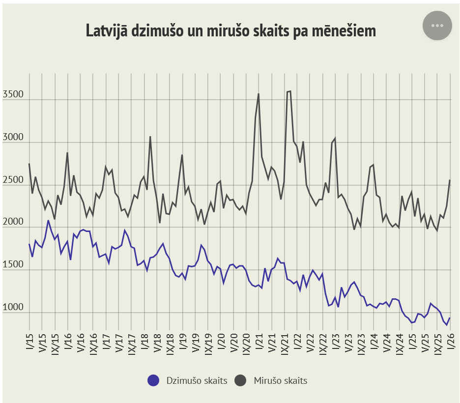 Tādējādi šogad janvārī reģistrēto mirušo skaits par 1613 pārsniedza dzimušo skaitu, kamēr pērn attiecīgajā periodā mirušo skaits par 1530 pārsniedza dzimušo skaitu.
