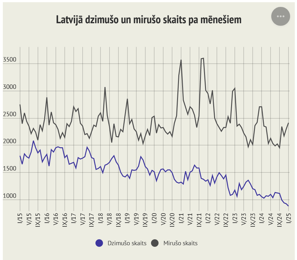 Tādējādi šogad janvārī reģistrēto mirušo skaits par 1527 pārsniedza dzimušo skaitu, kamēr pērn attiecīgajā periodā mirušo skaits par 1652 pārsniedza dzimušo skaitu.