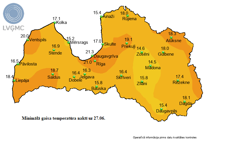 Viņa atklāja, ka gan pirmdien, gan arī otrdien vietām Latvijā gaisa temperatūra pēcpusdienas stundās paaugstināsies līdz +33 grādiem, savukārt nakts stundās dažviet pat nepazemināsies zem +20 grādiem, tādējādi Latvijā šajās dienās valdīs ekstremāls karstums.
