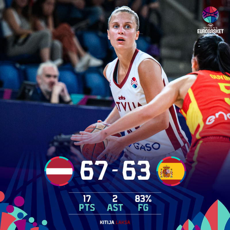 Spānija vinnēja cīņu zem groziem (42:34), bet Latvija biežāk pārķēra bumbu (10:4).