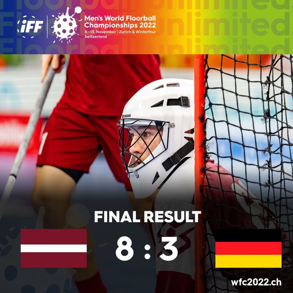 Vācieši vienus vārtus atguva, taču atlikušajās piecās minūtēs no zaudējuma neizglābās. Punktu Latvijas izlases uzvarai pielika Krūmiņš, kurš pēc vārtsarga Jāņa Salceviča piespēles priekšpēdējā minūtē panāca 8:3.