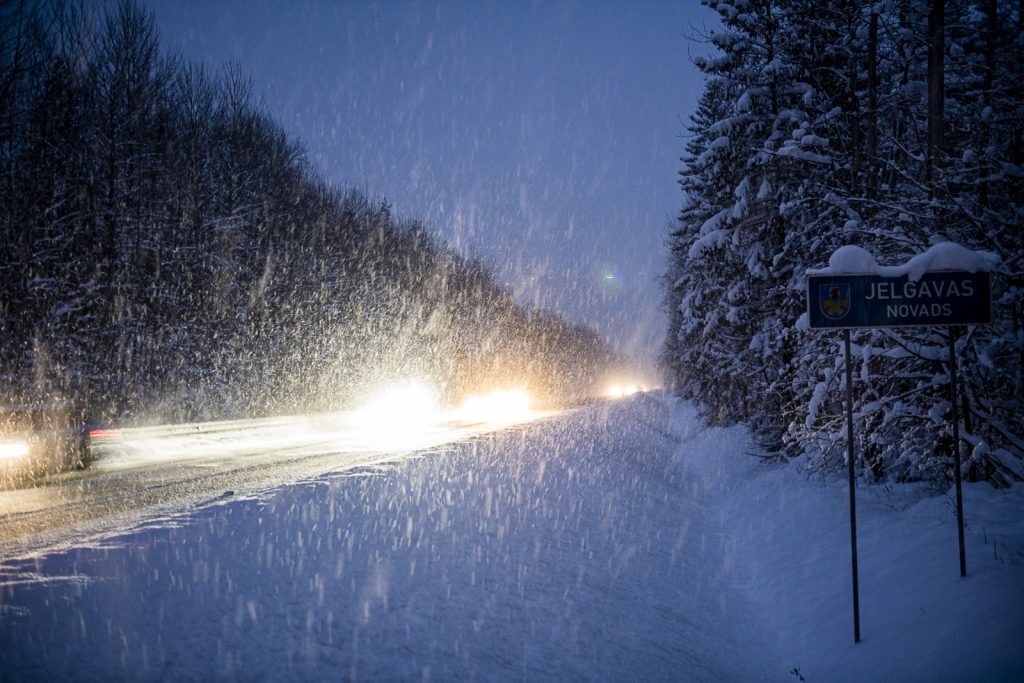 Redzamība sniegputenī vietām Dienvidkurzemē un Zemgalē samazinājusies līdz 500-800 metriem. Pasliktinās braukšanas apstākļi.