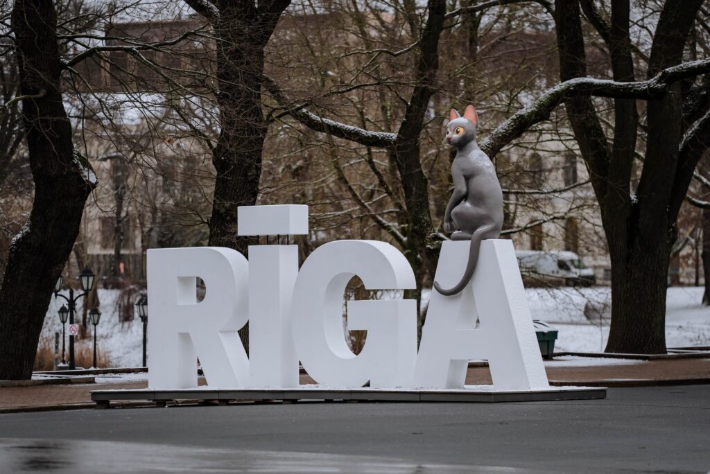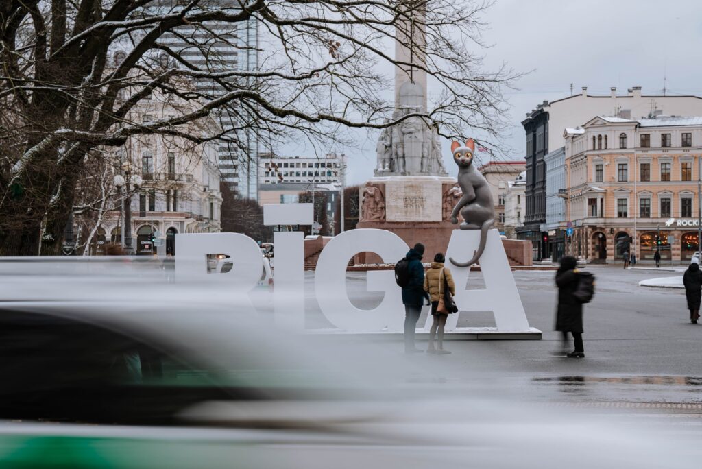 Laukumā pie Brīvības pieminekļa uz uzraksta "Rīga" novietots animācijas filmas "Straume" varonis kaķis