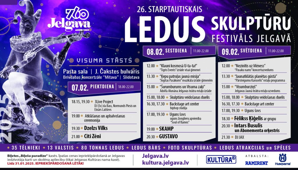 No 7. līdz 9. februārim Jelgava pārvērtīsies par īstu ledus mākslas valstību, jo Pasta salā, tās publiskajā slidotavā un Jāņa Čakstes bulvārī norisināsies 26. Starptautiskais Ledus skulptūru festivāls. Šogad festivālā 35 tēlnieki no 13 dažādām valstīm strādās ar 80 tonnām kristāldzidra ledus, lai atspoguļotu savu redzējumu par tēmu “Visuma stāsts”, portālu informēja Jelgavas valstspilsētas iestādes “Kultūra” pašvaldības sabiedrisko attiecību speciāliste Ieva Bolmane.